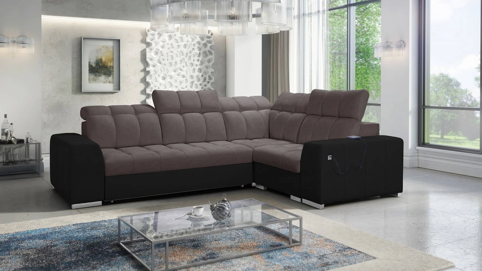 Die Extras dieses Möbels, die alle Nutzer schätzen werden, sind der Bettzeugbehälter, die Schlaffunktion und die USB-Ladebuchse an der Seite des Eckmöbels.