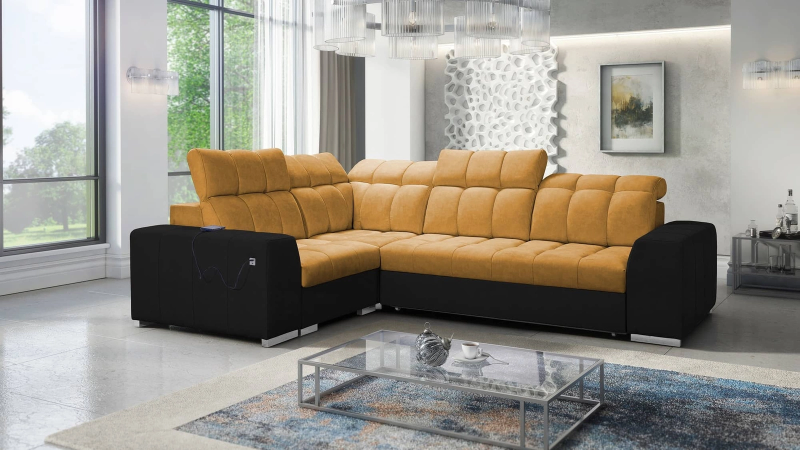 Die Extras dieses Möbels, die alle Nutzer schätzen werden, sind der Bettzeugbehälter, die Schlaffunktion und die USB-Ladebuchse an der Seite des Eckmöbels.