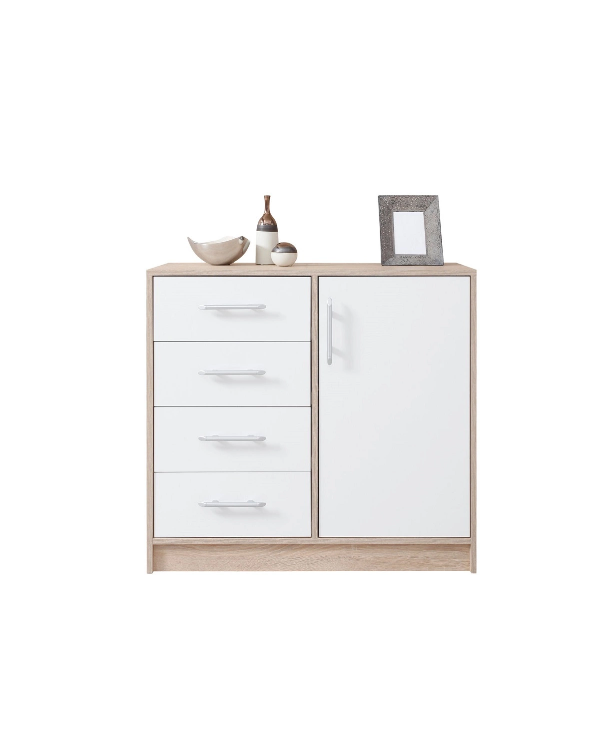 Die Kommode der Kollektion Caspe zeichnet sich durch ihre einfachen Formen aus. Die Möbel bestehen aus 1 Tür und 4 schubladen auszug auf Rollenschlitten. Die Fronten der Kommode werden durch Aluminiumgriffe ergänzt.