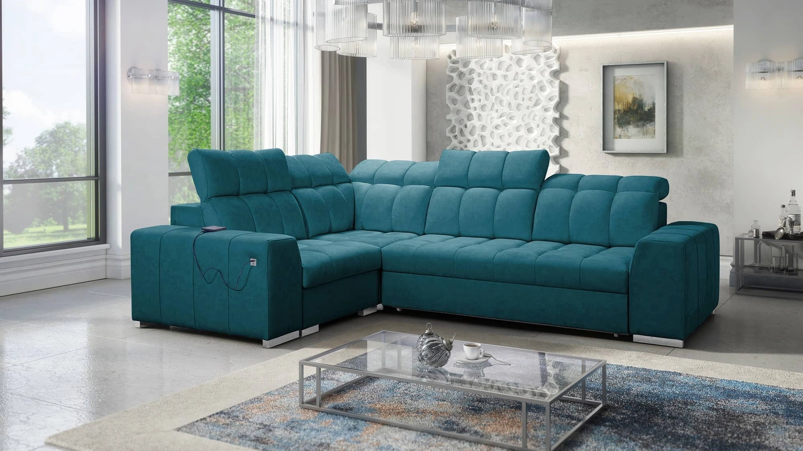 Die Extras dieses Möbels, die alle Nutzer schätzen werden, sind der Bettzeugbehälter, die Schlaffunktion und die USB-Ladebuchse an der Seite des Eckmöbels.