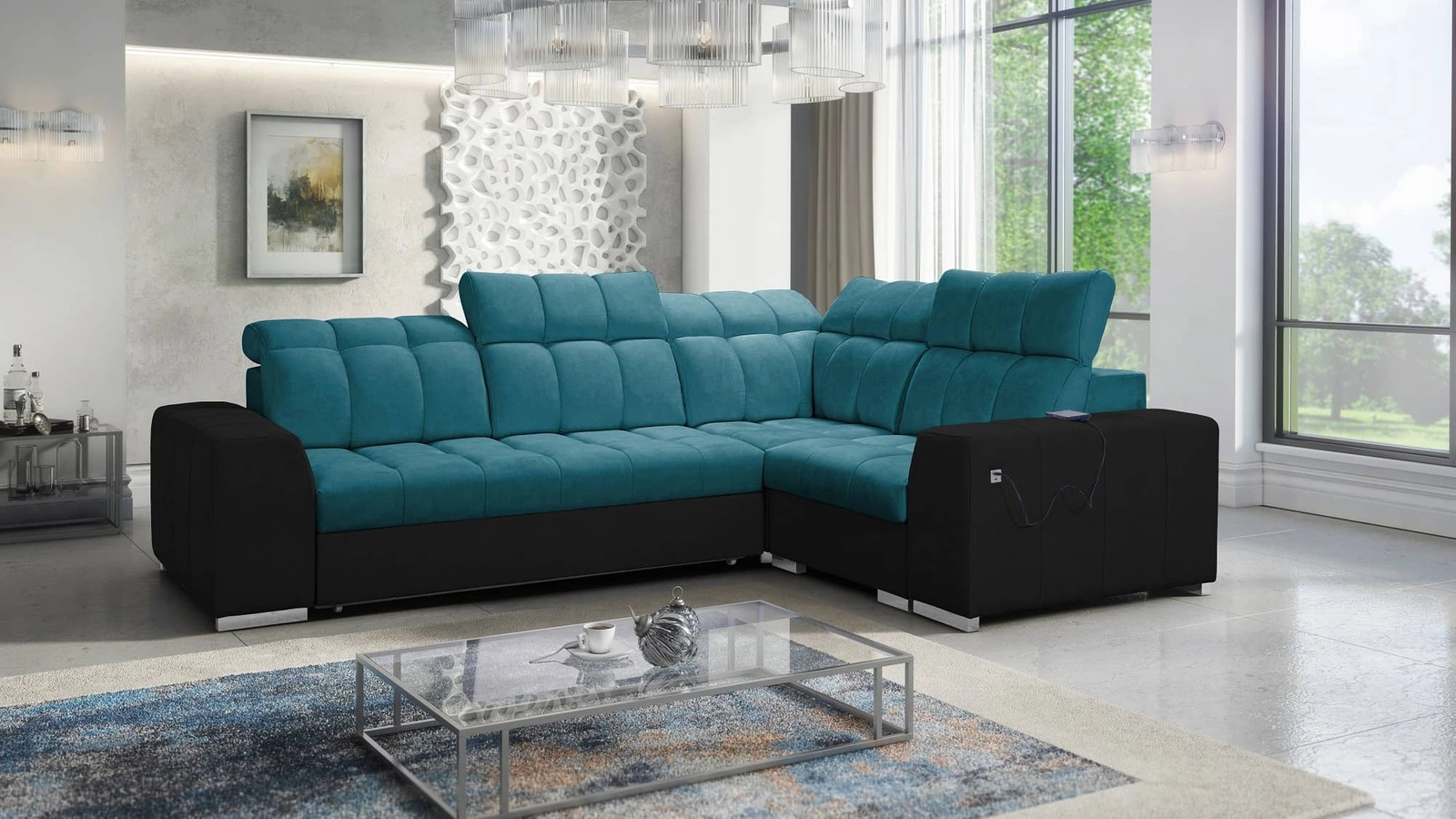 Ecksofa Luigi II in Türkis/Schwarz mit verstellbaren Kopfstützen ist ein reizvolles Möbelstück mit Garantie für höchsten Komfort und Funktionalität!