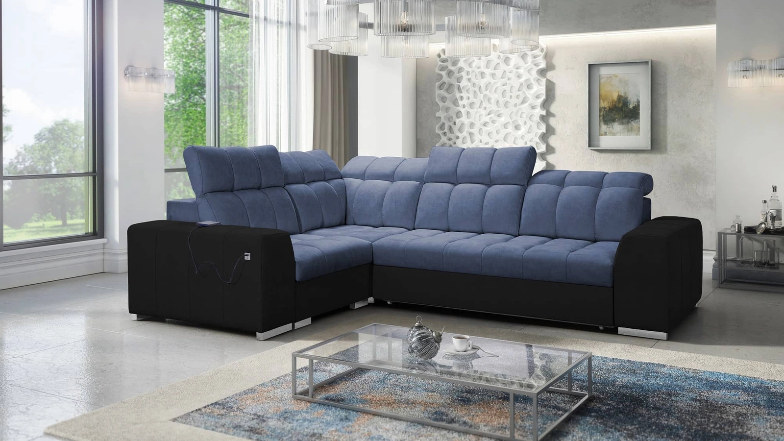 Ecksofa Luigi II in Blau / Schwarz mit verstellbaren Kopfstützen ist ein reizvolles Möbelstück mit Garantie für höchsten Komfort und Funktionalität!
