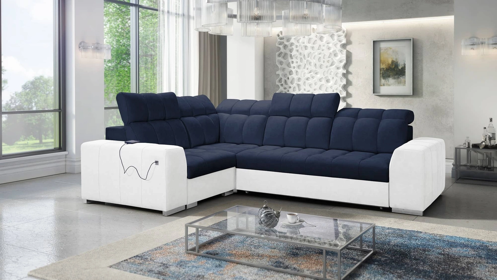 Ecksofa Luigi II in marineblau / weiß mit verstellbaren Kopfstützen ist ein reizvolles Möbelstück mit Garantie für höchsten Komfort und Funktionalität!