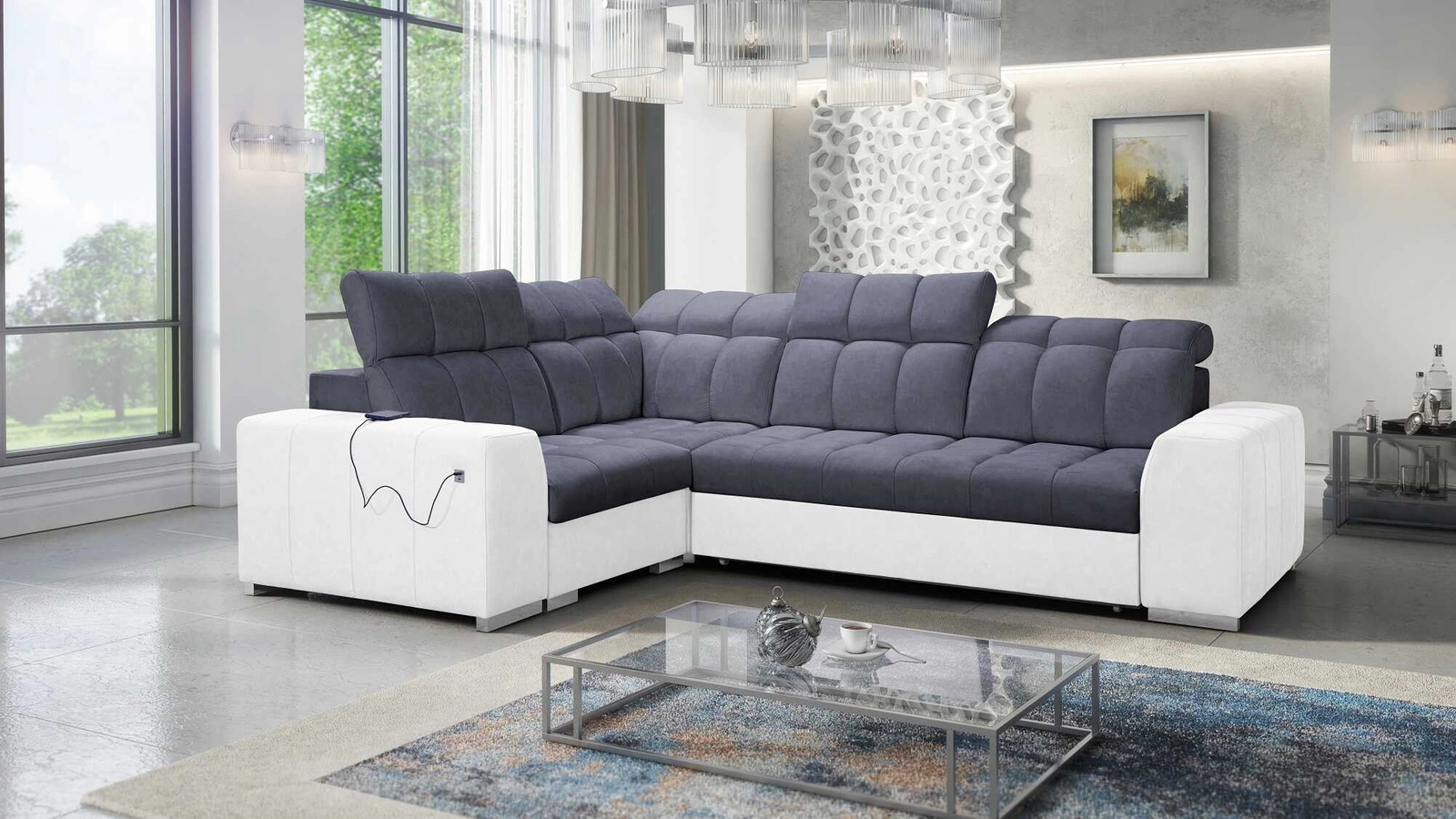 Die Extras dieses Möbels, die alle Nutzer schätzen werden, sind der Bettzeugbehälter, die Schlaffunktion und die USB-Ladebuchse an der Seite des Eckmöbels.