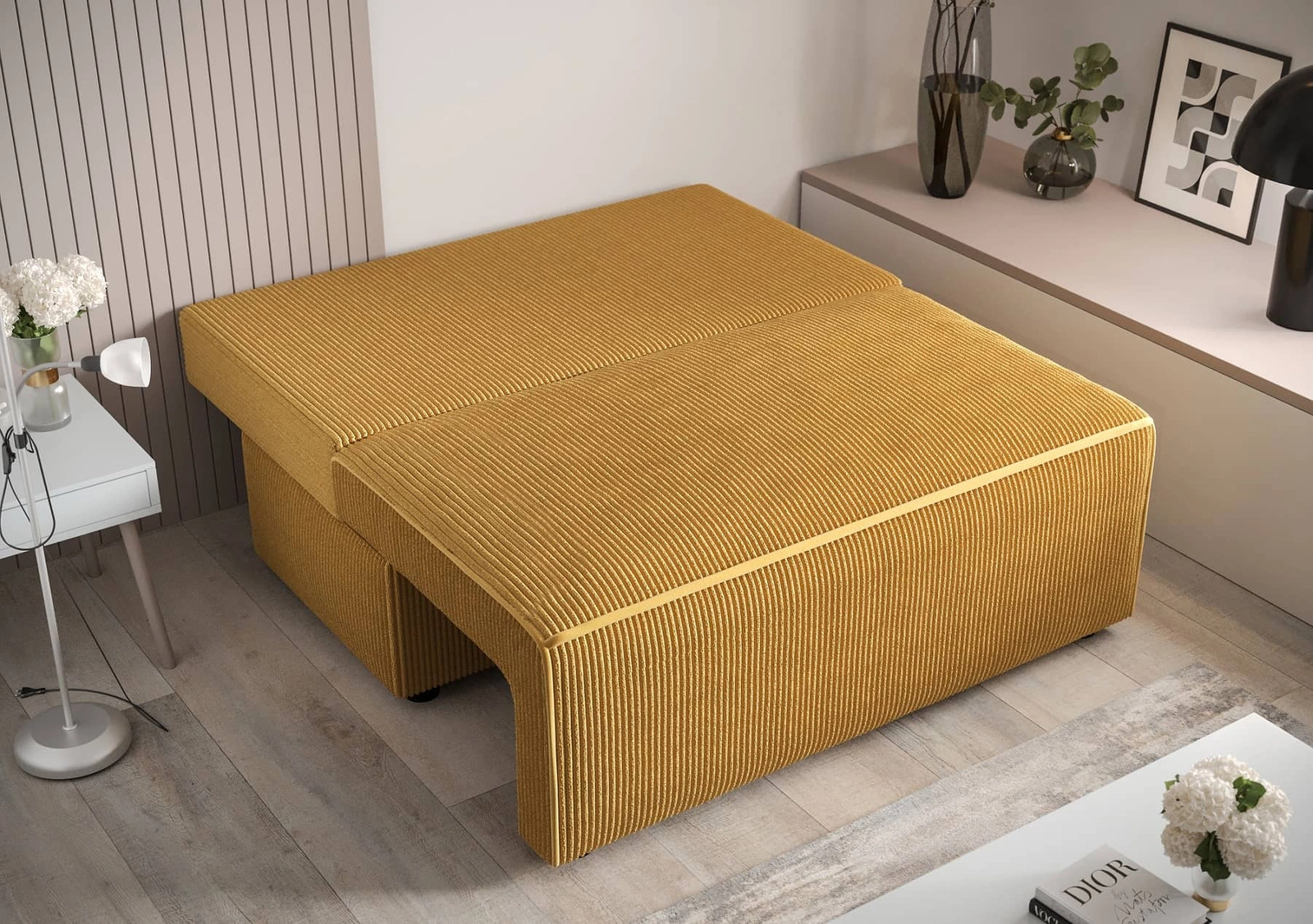 Das Ausklappen der kompletten Liegefläche ist sehr einfach und erfordert keinen großen Kraftaufwand. Das alles dank des DL-Mechanismus, der sich durch seine einfache Konstruktion und lange Lebensdauer auszeichnet. Die Liegefläche des Sofas beträgt 131x130 cm. Die Möbel sind mit runden, niedrigen Beinen aus Kunststoff ausgestattet. Dieses funktionelle Sofa passt in jede Art von Raum! Garantiert eine komfortable und störungsfreie Nutzung und eine lange Lebensdauer des gesamten Möbelstücks. Ideal als Sofa für das Wohnzimmer, als Sofa mit Schlaffunktion und für jede Einrichtung in Ihrem Lieblingsstil!