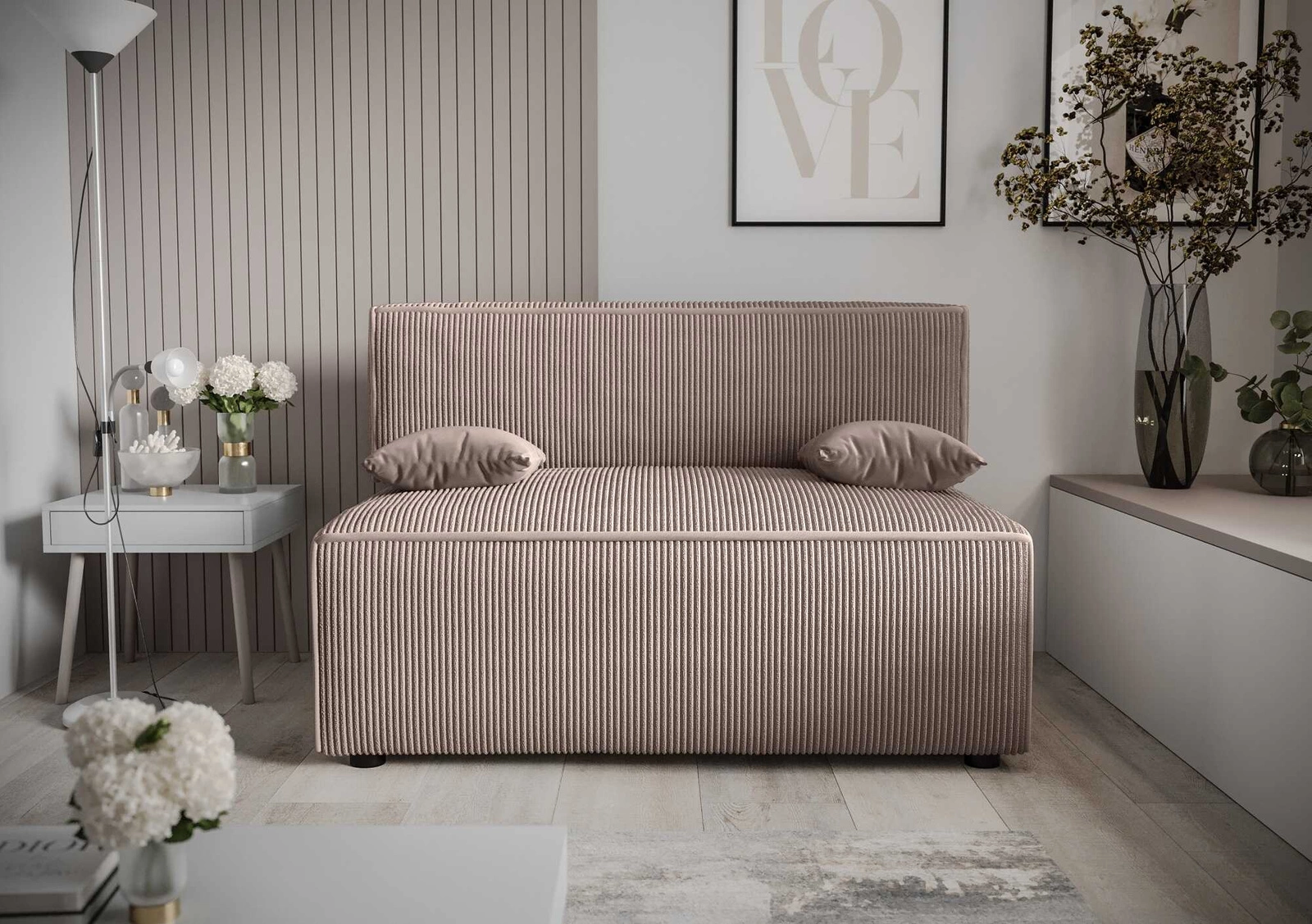 Couch hergestellt aus weich und angenehm anzufassen gewebe der Art velours Poso 03 garantiert maximalen Komfort und Funktionalität. Dreidimensional kordstoff mit ausgeprägten und dicken streifen verleihen dem Sofa einen besonderen Charakter und Schönheit. Der Stoff ist sehr weich und dennoch stark und robust. Der Poso-Polsterungsstoff ist widerstandsfähig gegen Abrieb, wie auch leicht sauber zu halten. So bleibt das Sofa lange Zeit ästhetisch ansprechend. Aufgrund seiner geringen Größe ist das Schlafsofa für kleinere Wohnungen geeignet, in denen Platzersparnis an erster Stelle steht.