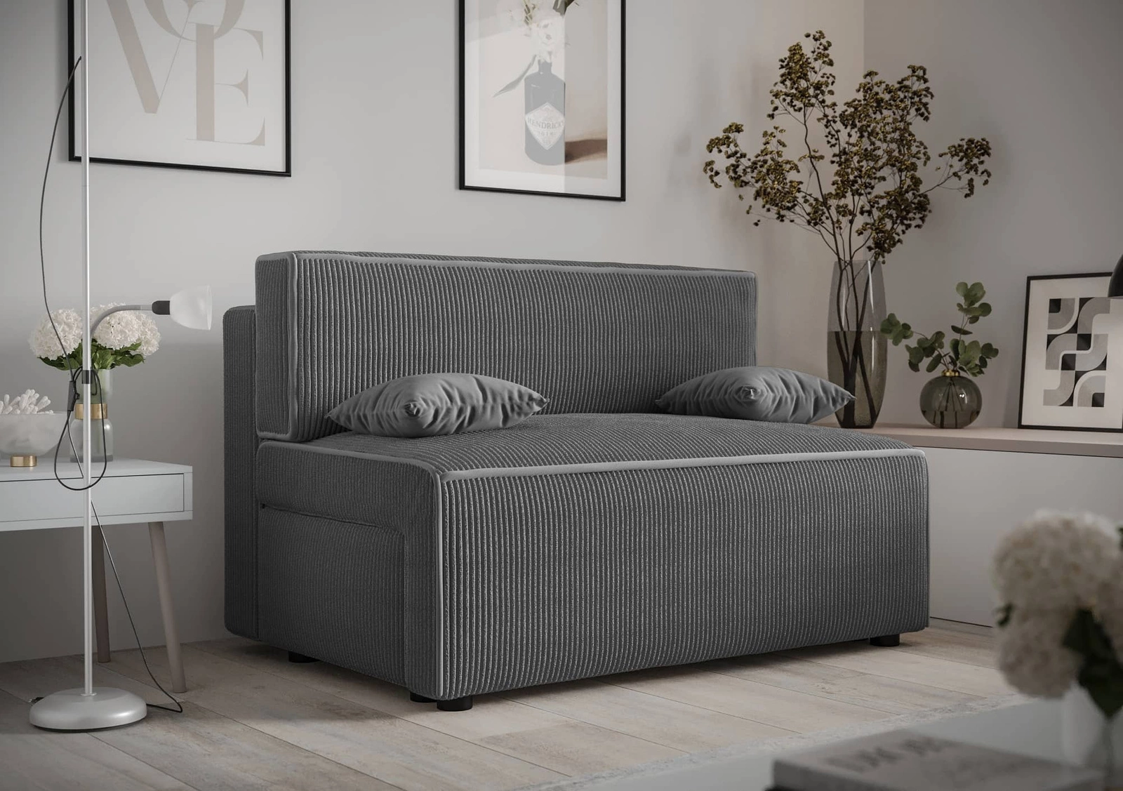 Couch hergestellt aus weich und angenehm anzufassen gewebe der Art velours Poso 60 garantiert maximalen Komfort und Funktionalität. Dreidimensional kordstoff mit ausgeprägten und dicken streifen verleihen dem Sofa einen besonderen Charakter und Schönheit. Der Stoff ist sehr weich und dennoch stark und robust. Der Poso-Polsterungsstoff ist widerstandsfähig gegen Abrieb, wie auch leicht sauber zu halten. So bleibt das Sofa lange Zeit ästhetisch ansprechend. Aufgrund seiner geringen Größe ist das Schlafsofa für kleinere Wohnungen geeignet, in denen Platzersparnis an erster Stelle steht.