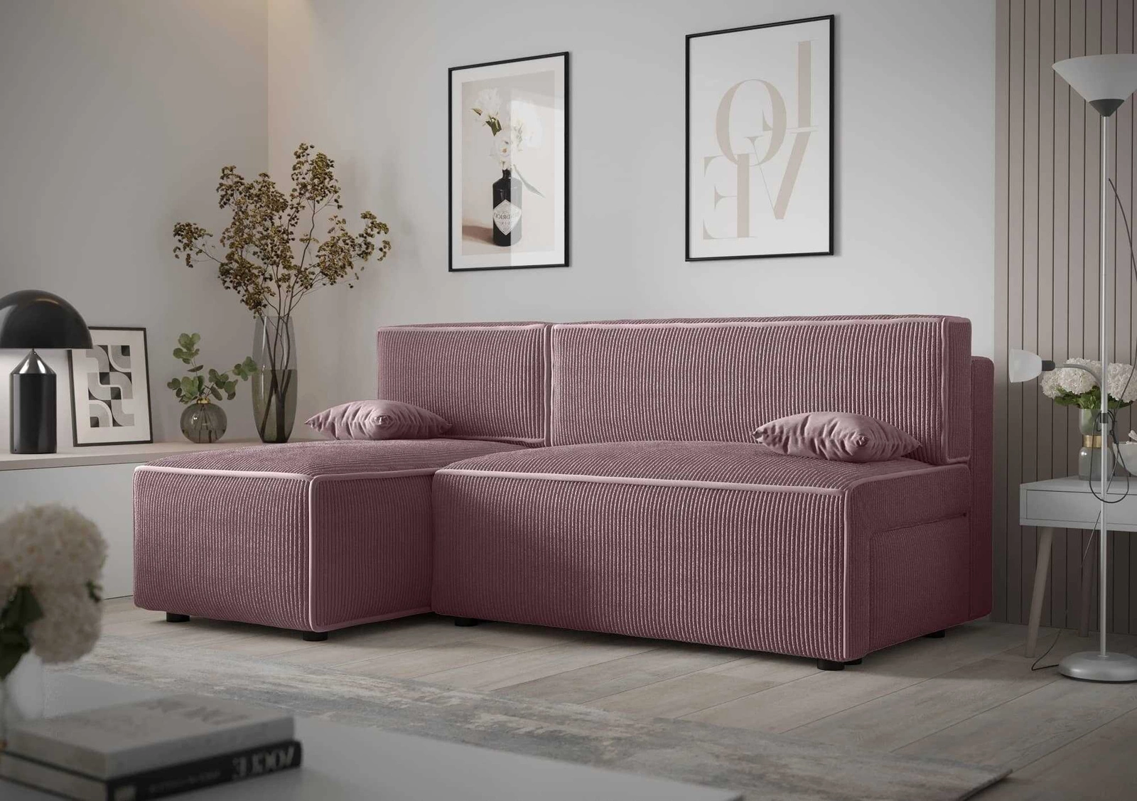Eckeinheit mit Schlaffunktion Brandon ist ein einfaches Möbelstück mit modernem Design, das sich perfekt in jede Einrichtung einfügt. Das Sofa ist vollständig mit einem Stoff des Typs velours Poso 27. Dreidimensional kordstoff mit seiner ausgeprägten und dicken Rippung verleiht dem Sofa einen besonderen Charakter und macht es einmalig schön. Der Stoff ist sehr weich und dennoch stark und robust. Der Poso-Bezugsstoff ist abriebfest, wie auch leicht sauber zu halten. So wird das Brandon Klapp-Ecksofa für lange Zeit ästhetisch und elegant aussehen. Das Ecksofa mit täglicher Schlaffunktion ist aus hochwertigen Materialien gefertigt, die gegen äußere Einflüsse wie Möbelbezüge und verschiedene Arten von Stößen resistent sind.