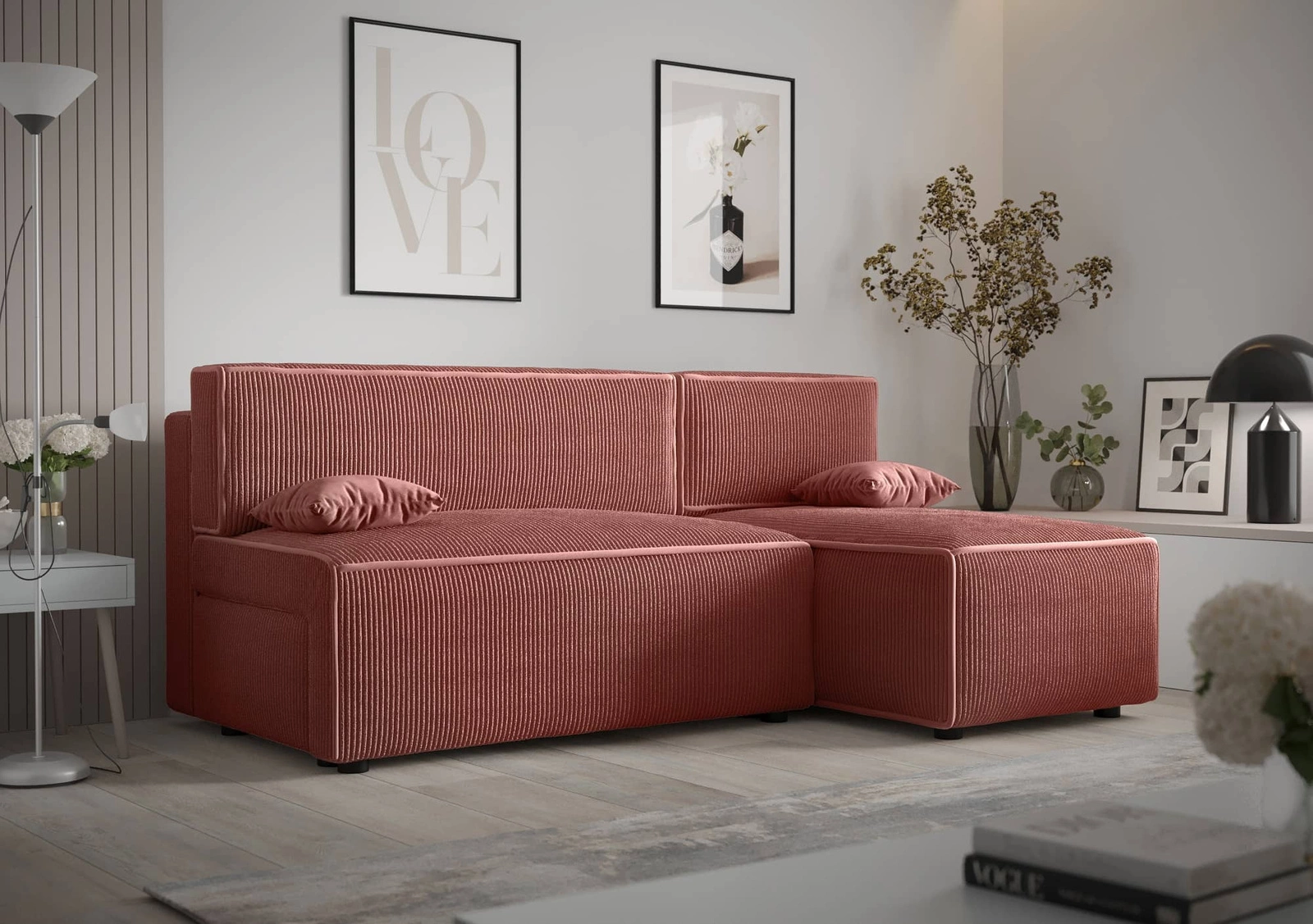 Eckeinheit mit Schlaffunktion Brandon ist ein einfaches Möbelstück mit modernem Design, das sich perfekt in jede Einrichtung einfügt. Das Sofa ist vollständig mit einem Stoff des Typs velours Poso 29. Dreidimensional kordstoff mit seiner ausgeprägten und dicken Rippung verleiht dem Sofa einen besonderen Charakter und macht es einmalig schön. Der Stoff ist sehr weich und dennoch stark und robust. Der Poso-Bezugsstoff ist abriebfest, wie auch leicht sauber zu halten. So wird das Brandon Klapp-Ecksofa für lange Zeit ästhetisch und elegant aussehen. Der Eckschrank mit täglicher Schlaffunktion ist aus hochwertigen Materialien gefertigt, die gegen äußere Einflüsse wie Möbelbezüge und verschiedene Arten von Stößen resistent sind.