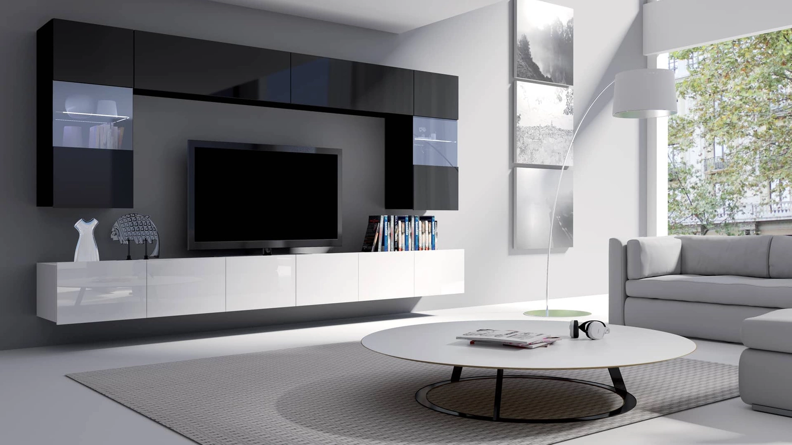 Die Schrankwand ist aus laminierter Platte von hoher Qualität, die resistent gegen äußere Einflüsse wie Druckstellen, Stöße und unglückliche Kratzer ist. Apulien Möbel Garantien störungsfreie Nutzung und Langlebigkeit der gesamten Schrankwand für viele Jahre der Nutzung. Die ikonische Kombination von Weiß und Schwarz großartig mischt sich mit anderen Farben, was die Apulia-Möbel zu einem großartigen siehe kann als Schrankwand für das Wohnzimmer oder als Schrankwand für das Wohnzimmer verwendet werden.
