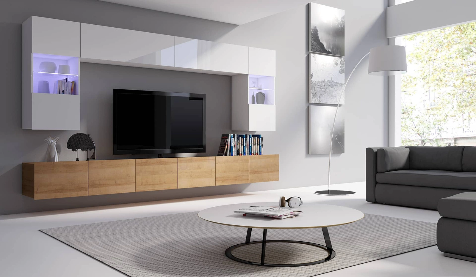 - Die Wohnwand Apulia ist ein modernes Design-Möbelstück, das Ihr Wohnzimmer stilvoll abrundet und ihm einen besonderen Charakter verleiht. Der warme Farbton der Eiche in Kombination mit Weiß vergrößert den Innenraum optisch. Schlichte Form kombiniert mit z