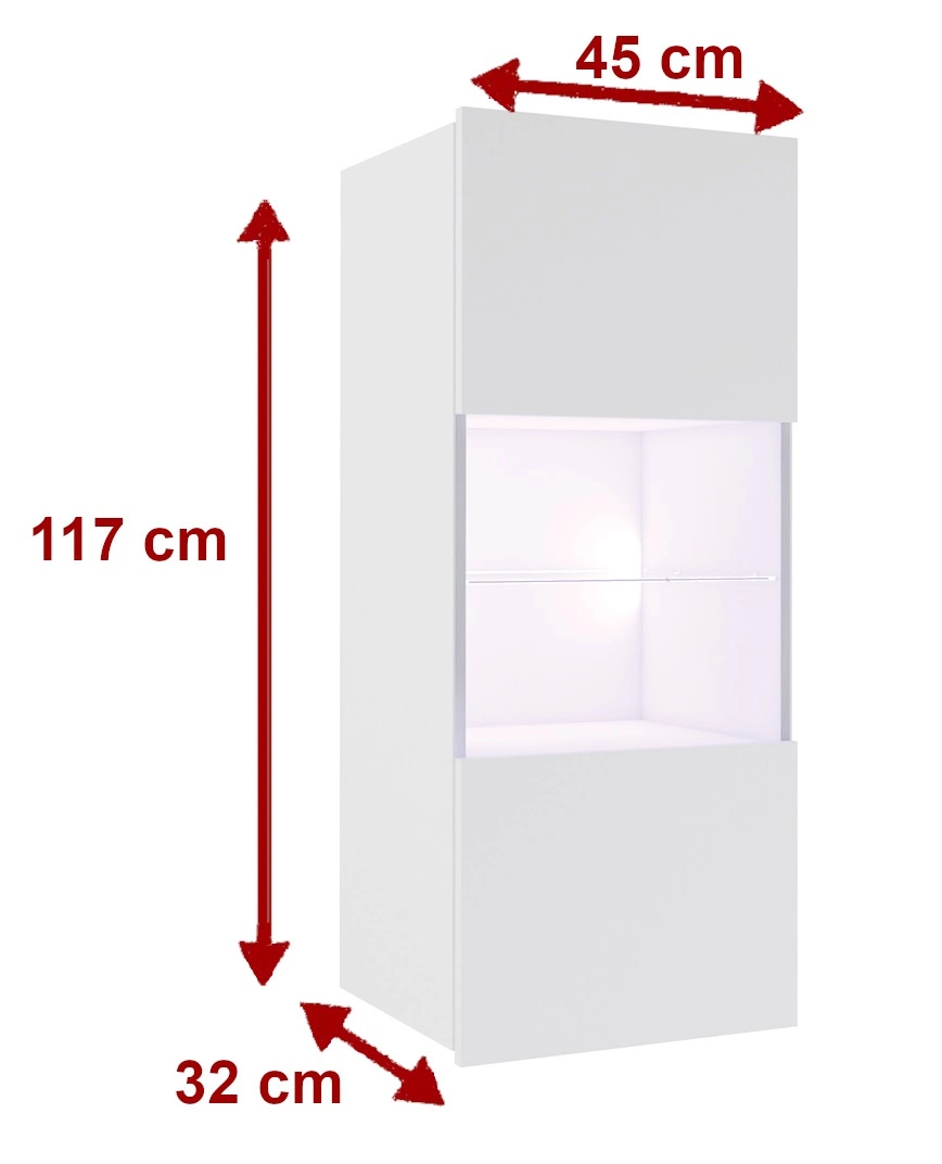 Verglaste Schaufensterfronten die Ausstellung von Wohnaccessoires ermöglichen. Geräumige RTV-Schränke kann sämtliches Zubehör und Ausrüstung aufnehmen. Subtelins überhängende Fronten auch als Griff dienen. Zusätzliche vorteil von des RTV-Schrankes ist die Möglichkeit, die Positionierung des Schrankes zu wählen. RTV-Schrank kann auf dem Boden stehen. Dank der mitgelieferten Aufhänger kann der RTV-Schrank schnell zu einem Hängeschrank werden kann eine Schrankwand werden.