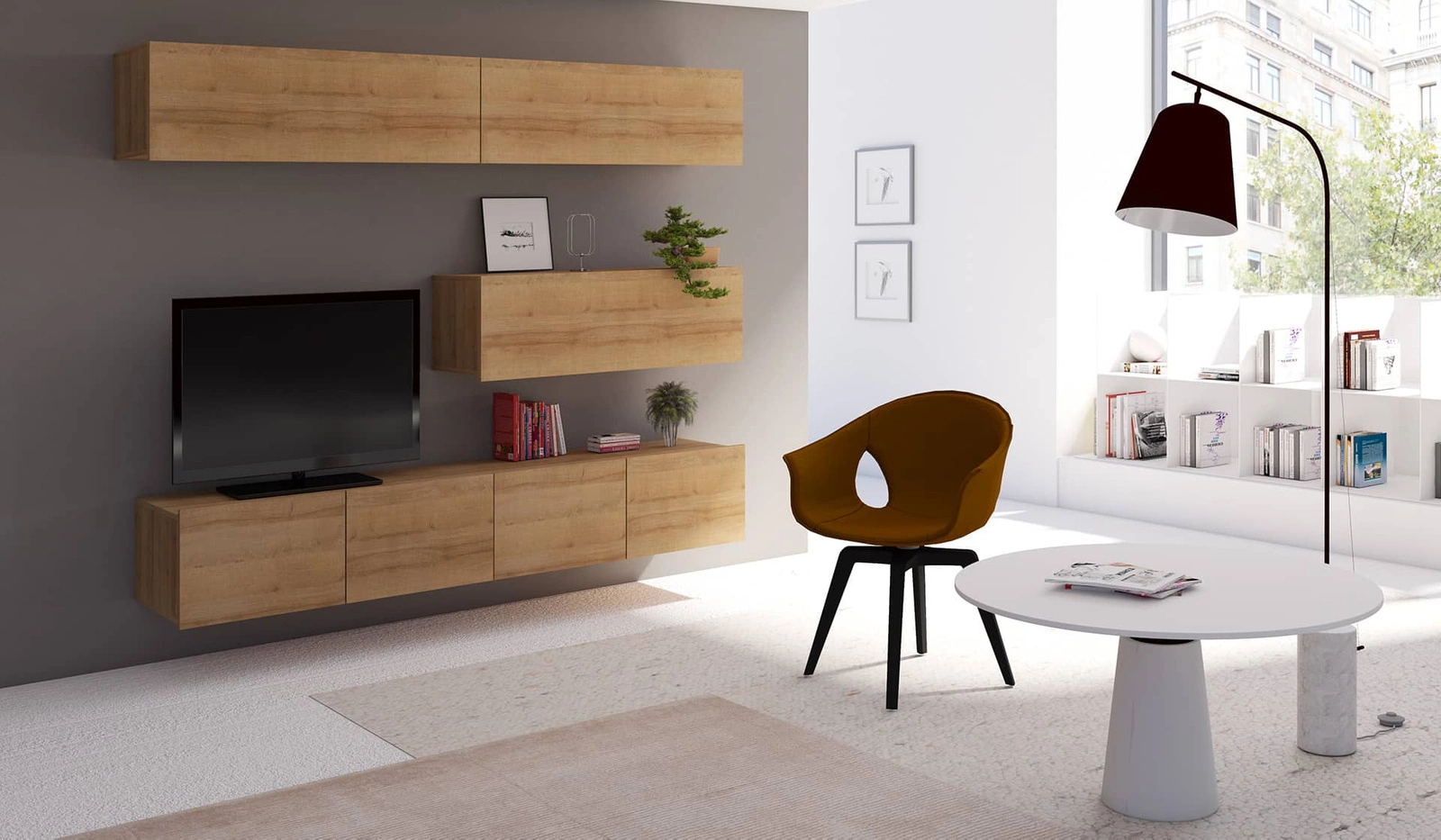 • Die Wohnwand Apulia ist ein modernes Design-Möbelstück, das Ihr Wohnzimmer stilvoll abrundet und ihm einen besonderen Charakter verleiht. Die warme Eichenholzfarbe schafft eine gemütliche und einzigartige Atmosphäre. Schlichte Form kombiniert mit zeitlose