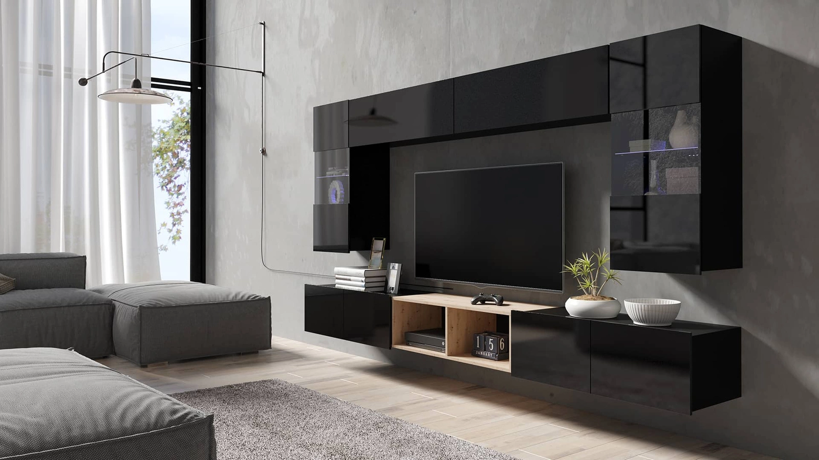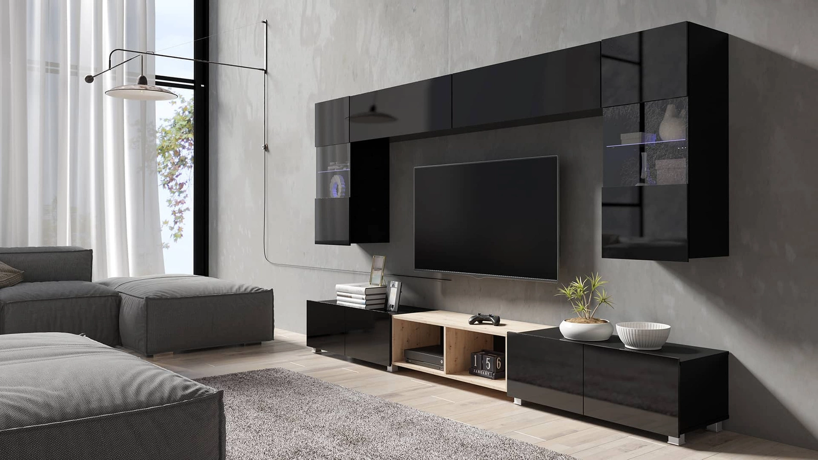 Möbelwand Apulia XXIV schwarz glänzend / Eiche handwerklich extrem stilvolle Möbelwand einfache Elemente, die in jedes Interieur passen