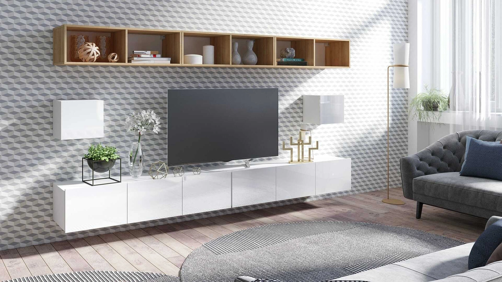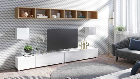 Offene Regale ermöglichen es Ihnen, die Accessoires, die Ihr Wohnzimmer schmücken, auf subtile Weise hervorzuheben. Geräumige RTV-Schränke kann sämtliches Zubehör und Ausrüstung aufnehmen. Subtelins überhängende Fronten auch als Griff dienen. Zusätzliche vorteil von der RTV-Schränke ist die Möglichkeit, die Art und Weise ihrer Anordnung zu wählen. RTV-Schrank kann auf dem Boden stehen. Dank der mitgelieferten Aufhänger kann der RTV-Schrank schnell zu einem Hängeschrank werden kann eine Schrankwand werden.
