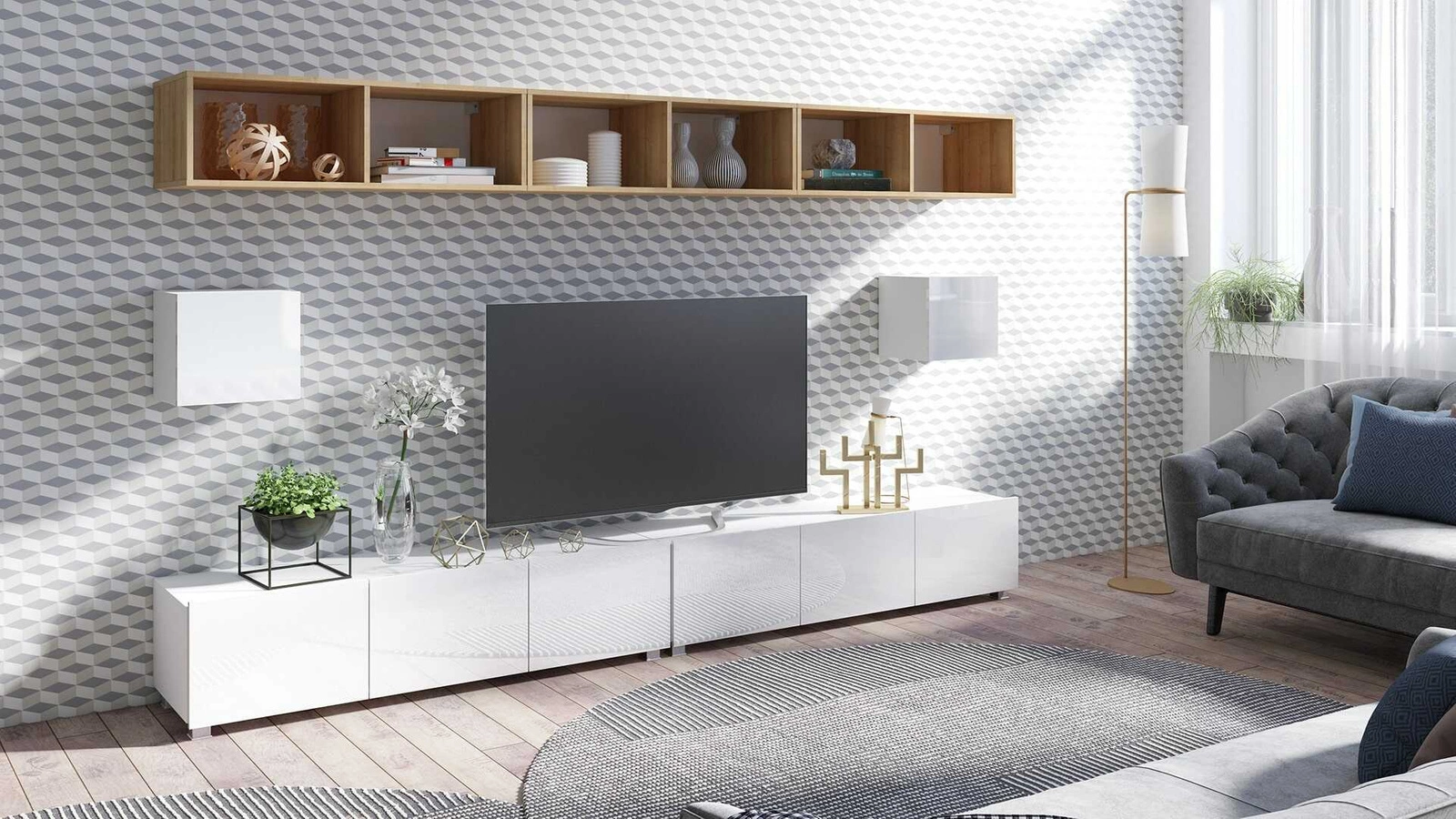 Möbel Apulia XXXIV weiß glänzend / goldene Eiche ein außergewöhnlich stilvolles Wandelement einfache Elemente, die in jedes Interieur passen