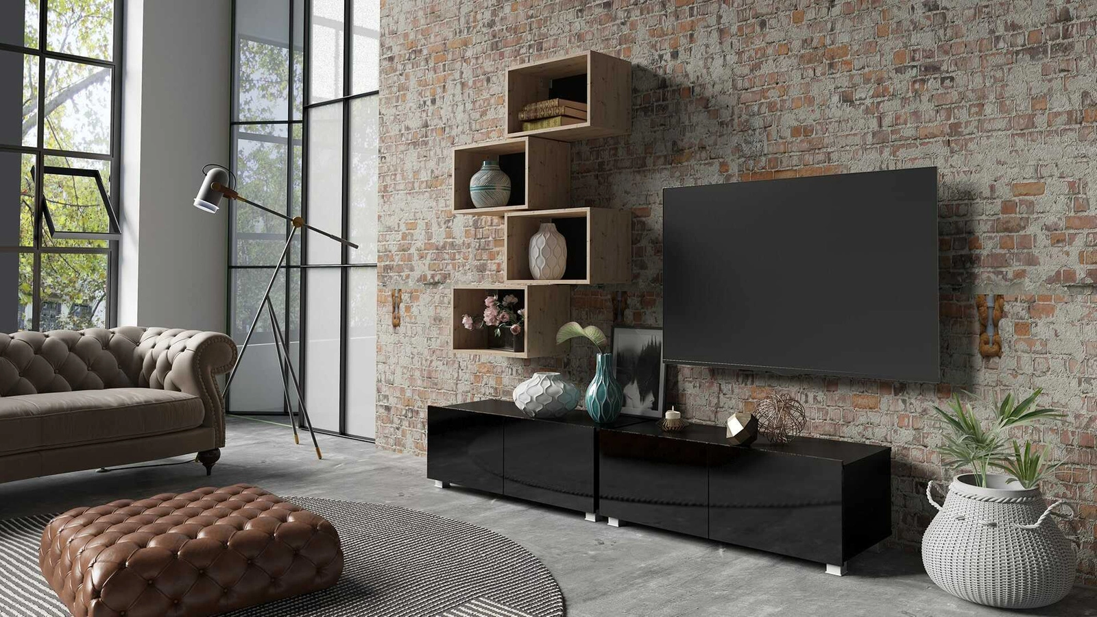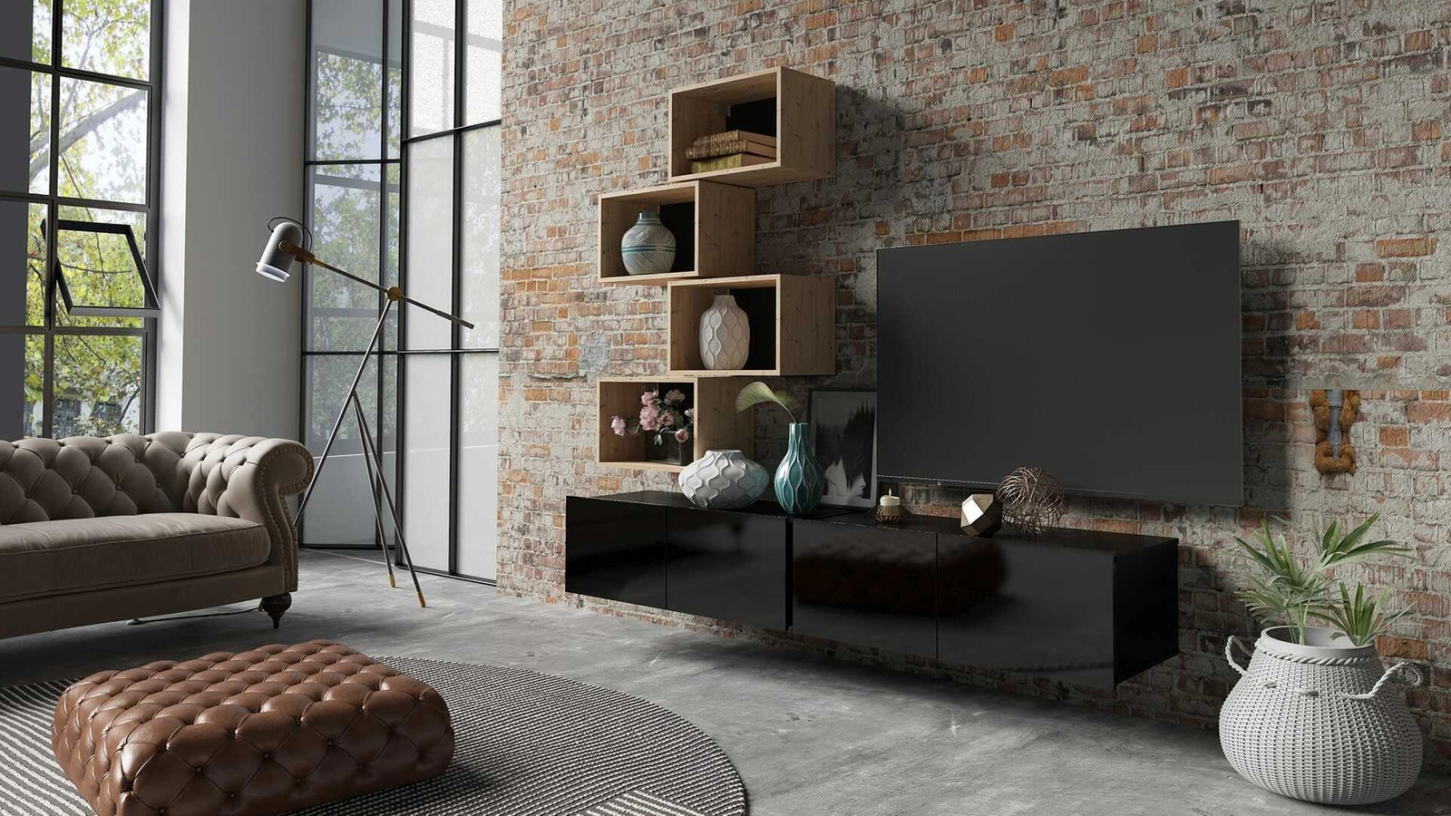 Apulia XXX Schrankwand glänzend schwarz / Eiche artisan Eine besonders stilvolle Schrankwand mit schlichten Möbelstücken, die sich in jede Einrichtung einfügt