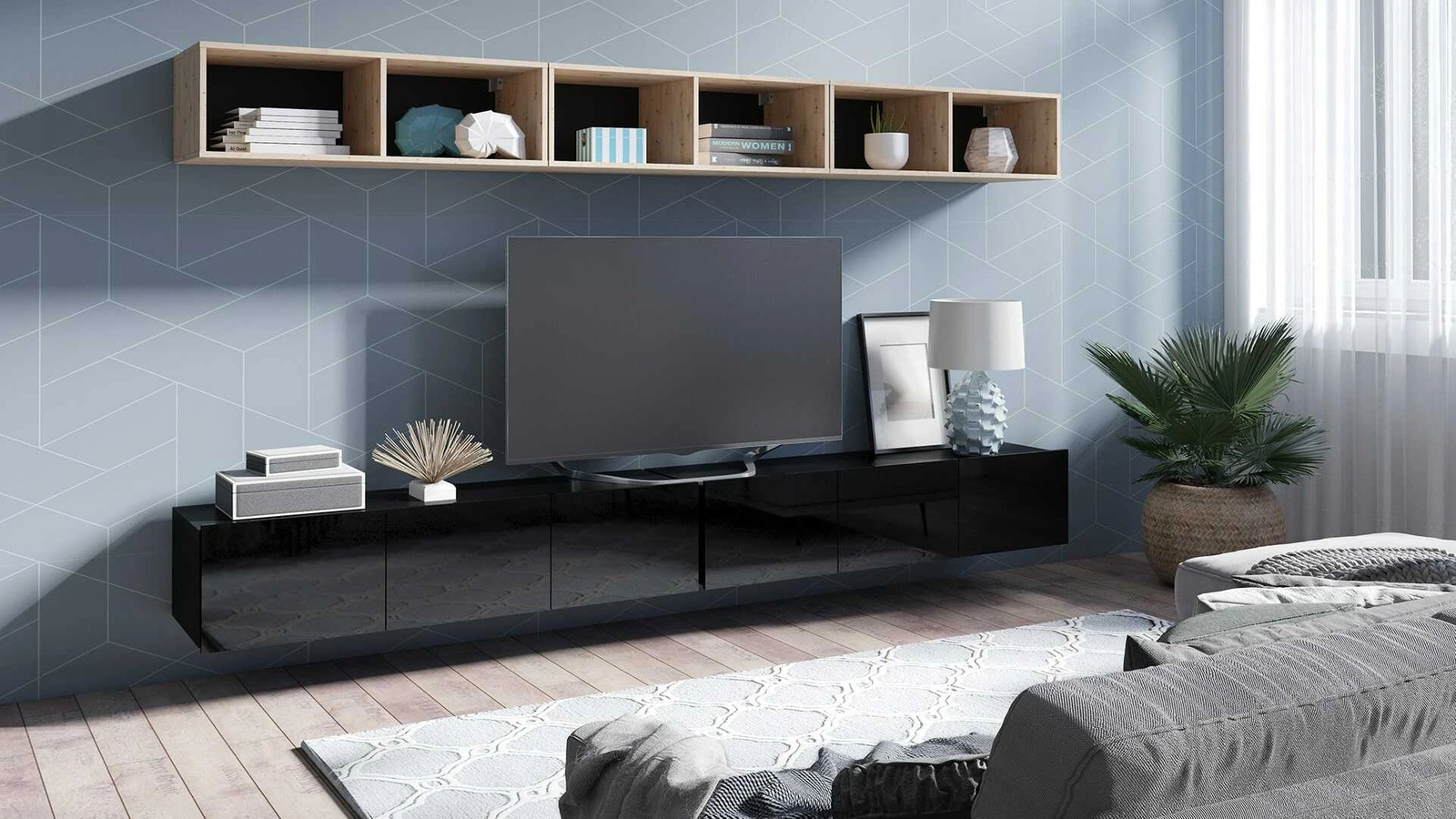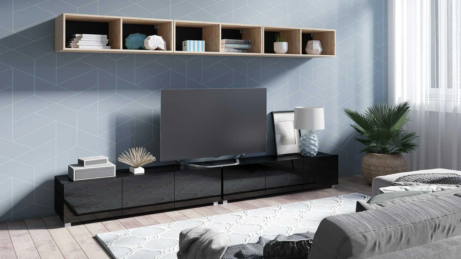 Offene Regale ermöglichen es Ihnen, die Accessoires, die Ihr Wohnzimmer schmücken, auf subtile Weise hervorzuheben. Geräumige RTV-Schränke kann sämtliches Zubehör und Ausrüstung aufnehmen. Subtelins überhängende Fronten auch als Griff dienen. Zusätzliche vorteil von der RTV-Schränke ist die Möglichkeit zu wählen, wie die Positionierung der. RTV-Schrank kann auf dem Boden stehen. Dank der mitgelieferten Aufhänger kann der RTV-Schrank schnell zu einem Hängeschrank werden kann eine Schrankwand werden.