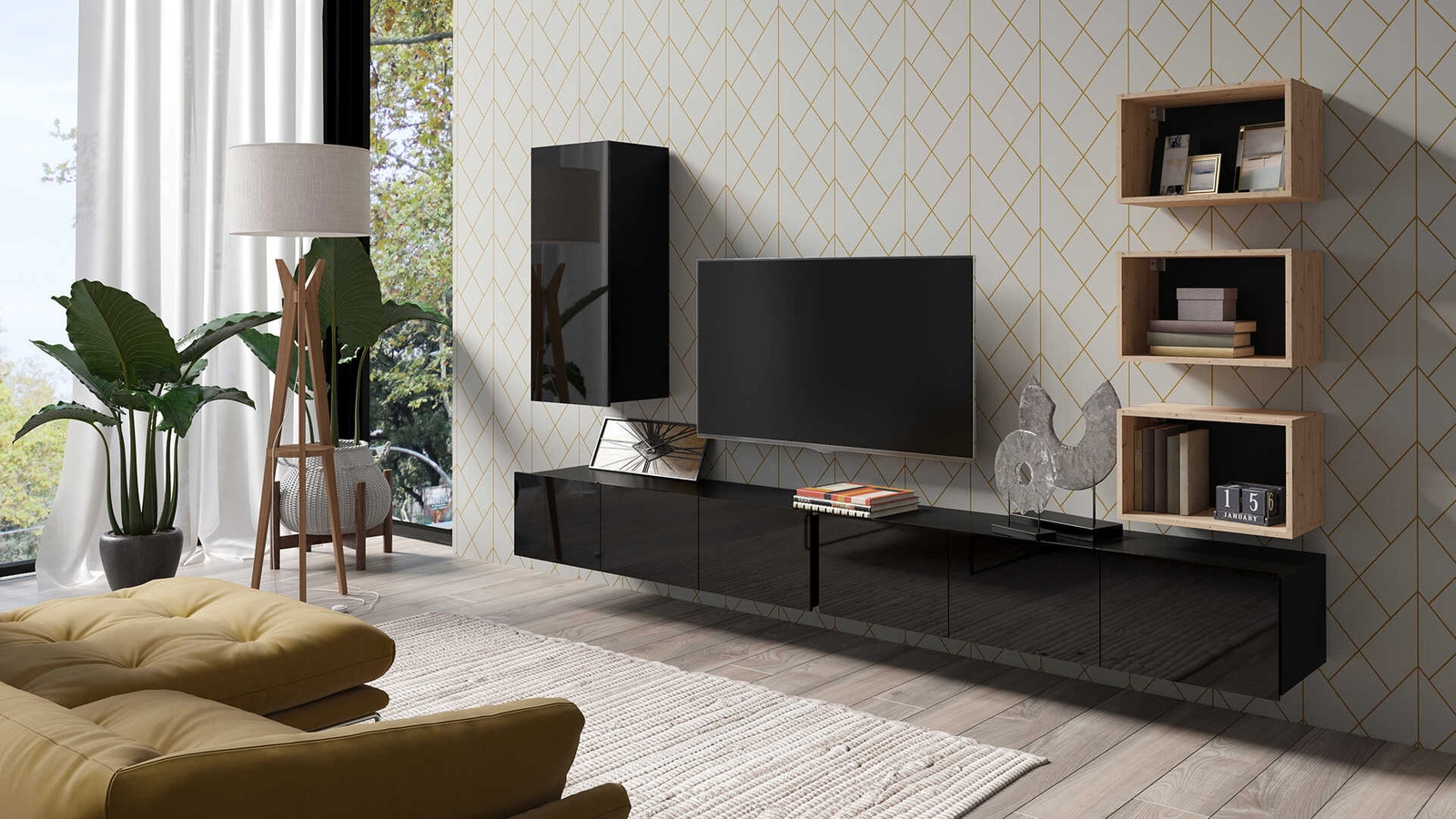 Apulia XXXVI schwarz glänzend / Eiche artisan Eine außergewöhnlich stilvolle Schrankwand mit schlichten Möbelstücken, die sich in jede Einrichtung einfügt