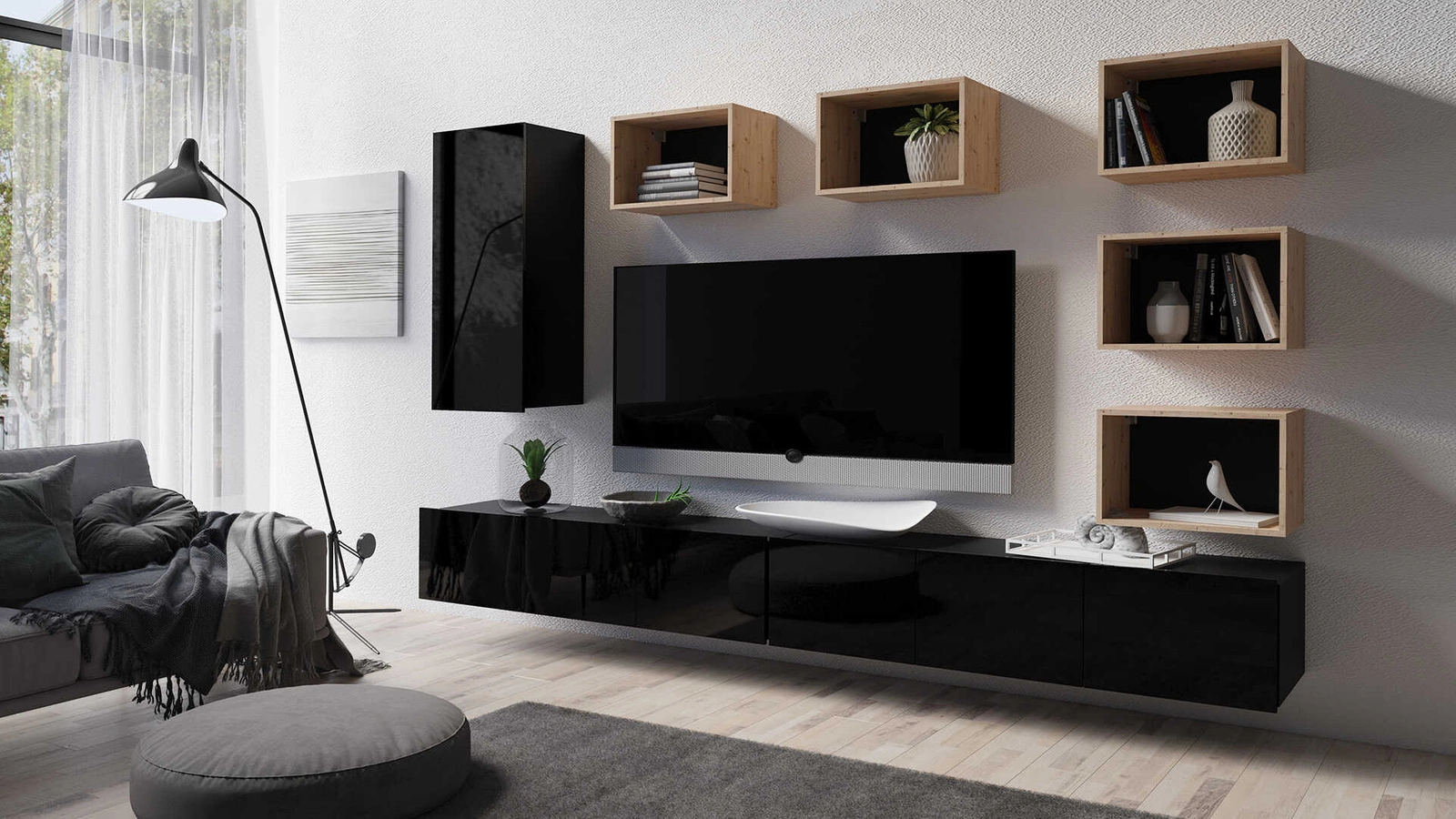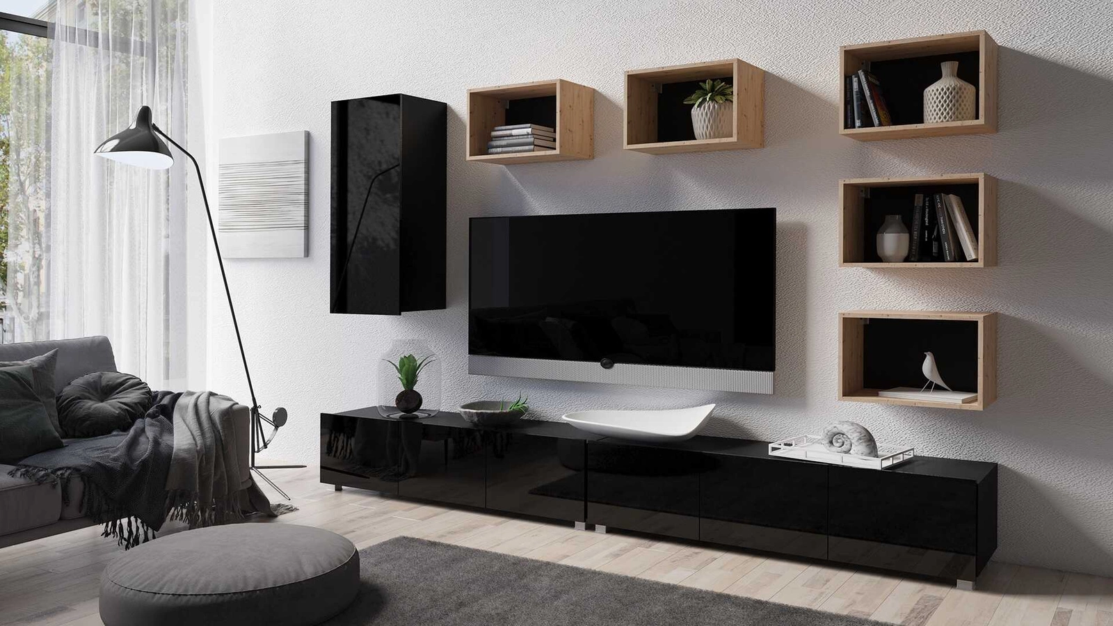 Apulia XXXVII schwarz glänzend / Eiche artisan Eine außergewöhnlich stilvolle Schrankwand mit schlichten Möbelstücken, die sich in jede Einrichtung einfügt
