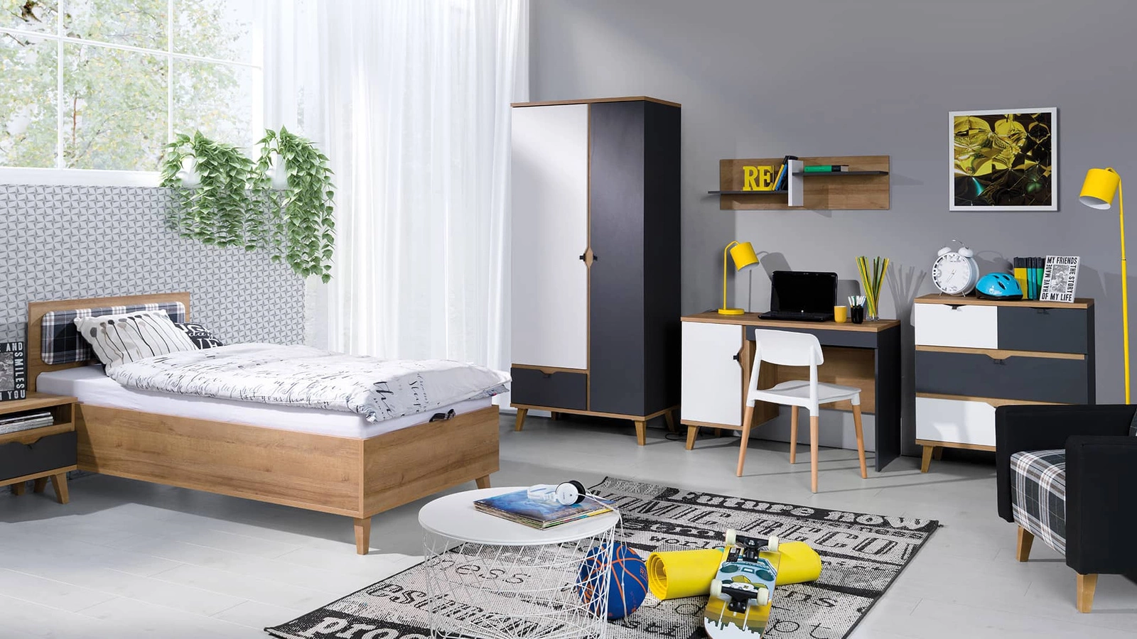 Nachttisch Memone zeichnet sich durch seinen skandinavischen Stil und die modischen Farben in gedeckten Tönen aus, wodurch sich der Nachttisch sowohl für ein Schlafzimmer als auch für ein Jugendzimmer eignet. Körperverbindung in farbton Eiche z graphit front wird ein modernes und einzigartiges Interieur schaffen. Sanfte Vertiefung auf der Vorderseite schubladen bieten originelle und originelle Dekoration. Eine stilvolle Ergänzung zu den Möbelfronten der Memone-Kollektion sind metallkantenhalterungen farblich schwarz.