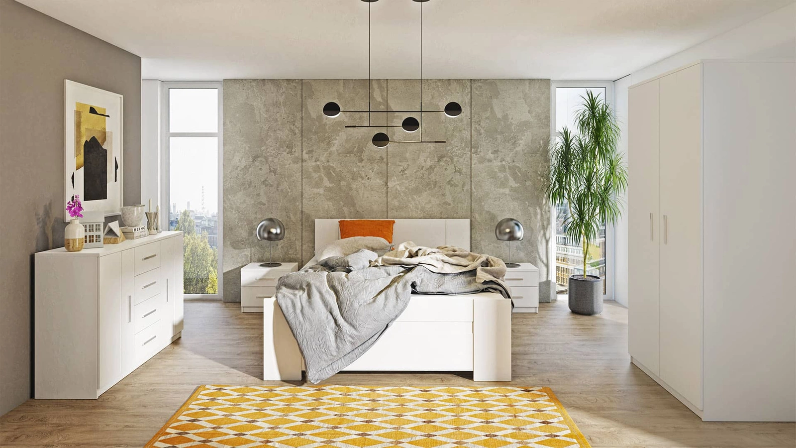 Bettgestell in weiß wurde hergestellt aus hochwertigem, 22 mm starkem Schichtstoffkarton, die resistent gegen äußere Einflüsse wie Druckstellen, Stöße und unglückliche Kratzer ist.