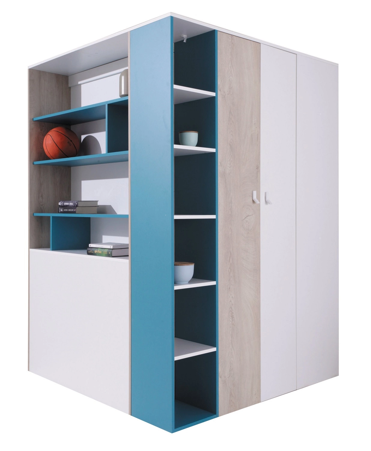 Der Eckschrank Niko mit Einlegeböden in Weiß / Eiche / Marine ist ein Rezept für eine moderne und funktionelle Jugendzimmereinrichtung.