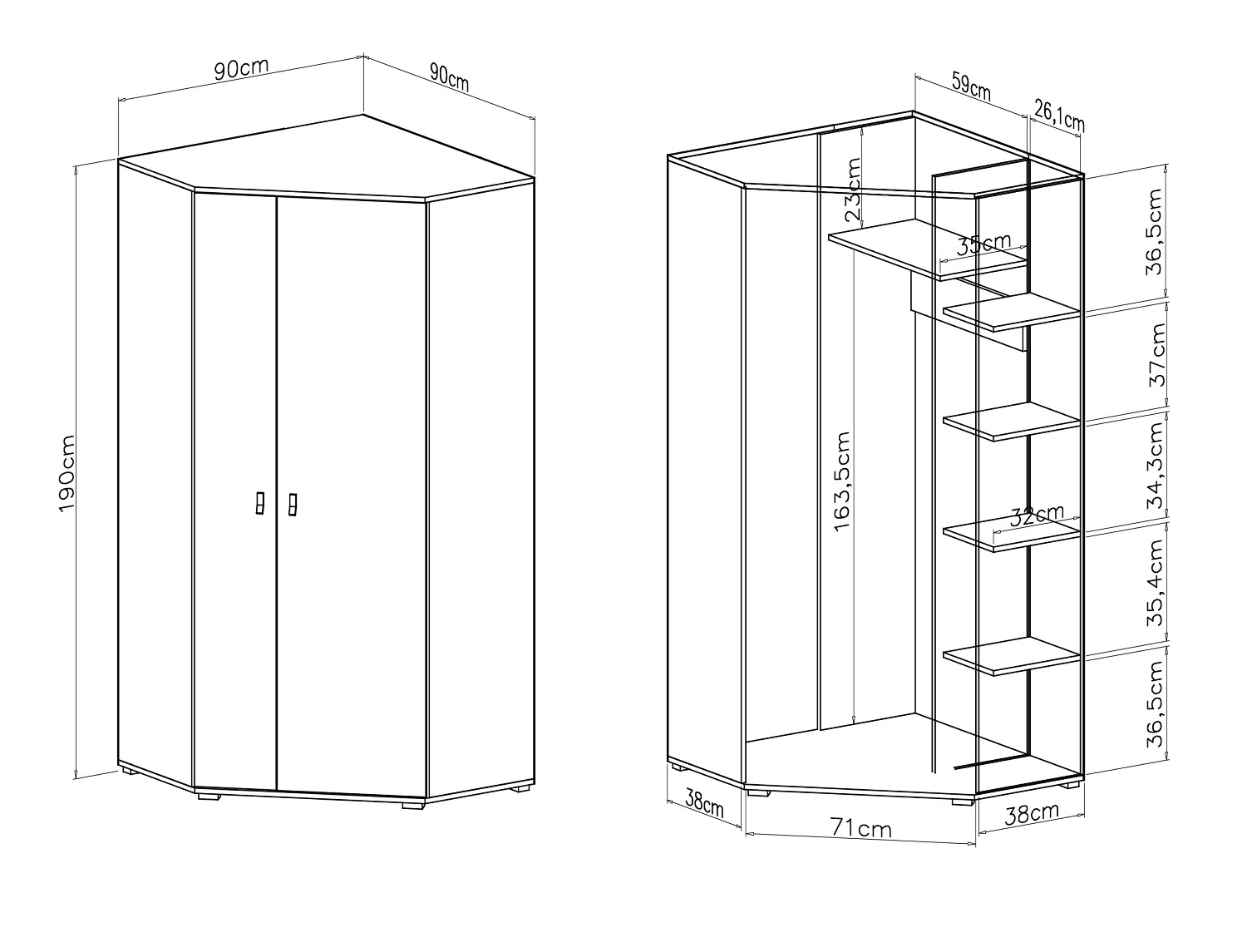 Breite 90 cm, höhe 190 cm und Tiefe 90 cm die Garderobe passt in jede Art von Raum! Der Eckschrank Niko garantiert komfortable und problemlose Nutzung und Langlebigkeit des gesamten Möbelstücks für viele Jahre der Nutzung.