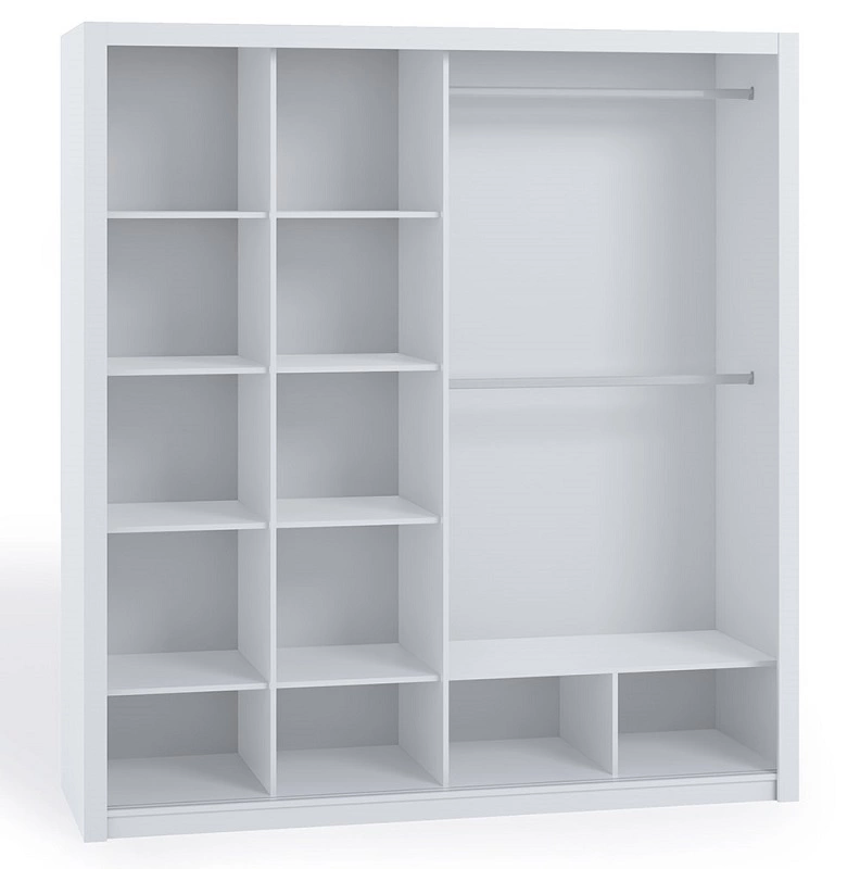 Der Rico-Schrank ist unterteilt in teil mit zwei Stäben i teil mit Regalen. Das Kabinett wurde hergestellt aus hochwertiger laminierter Karton, die resistent gegen äußere Einflüsse wie Druckstellen, Stöße und unglückliche Kratzer ist. Ein stilvoller Abschluss für Schranktüren schieben sind silber griffe, die zusätzlich zu ihrer Hauptfunktion ein äußerst geschmackvolles Erscheinungsbild bieten.