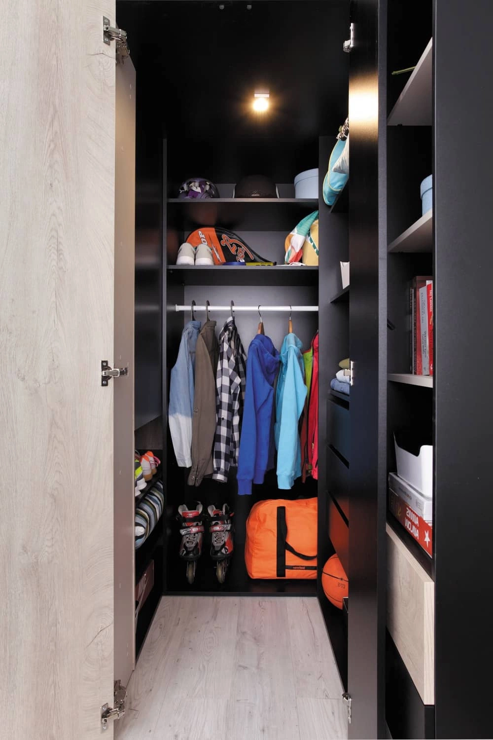 Die Eckgarderobe mit Niko-Bücherregalen in Schwarz/Eiche/Beige ist ein Rezept für eine moderne und funktionelle Jugendzimmereinrichtung.