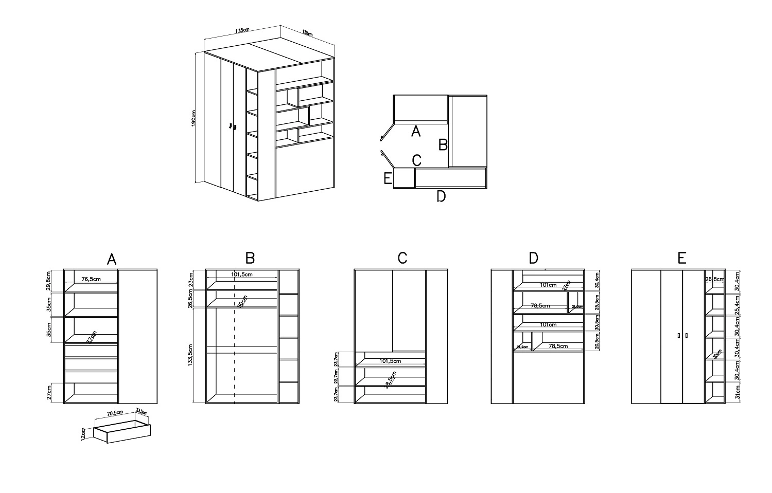 Breite 135 cm, höhe 190 cm und Tiefe 135 cm die Garderobe passt in jede Art von Raum! Der Eckschrank Niko mit Einlegeböden garantiert komfortable und problemlose Nutzung und Langlebigkeit des gesamten Möbelstücks für viele Jahre der Nutzung.