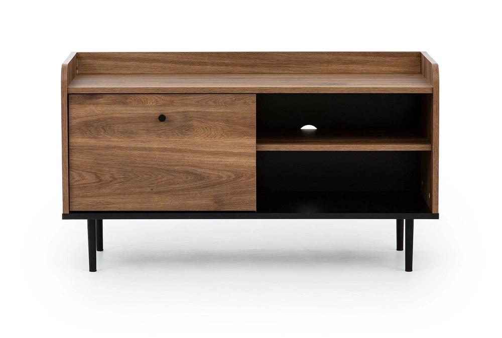 Der Oberschrank besteht aus laminierter Platte von hoher Qualität 16 mm dick, die resistent gegen äußere Einflüsse wie Druckstellen, Stöße und unglückliche Kratzer ist. Ein stilvoller Abschluss der Fronten des Oberschranks sind die kleinen griffe in Schwarz. Jeder der Feststoffe wurde unterstützt durch metallsockel. Geräumige Kommode bietet Platz für alle Zubehörteile und Geräte. Offene Schrankregale RTV sind ein idealer Ort für Ihre audiovisuelle Ausrüstung. Couchtischplatte ist auslaufsicher.