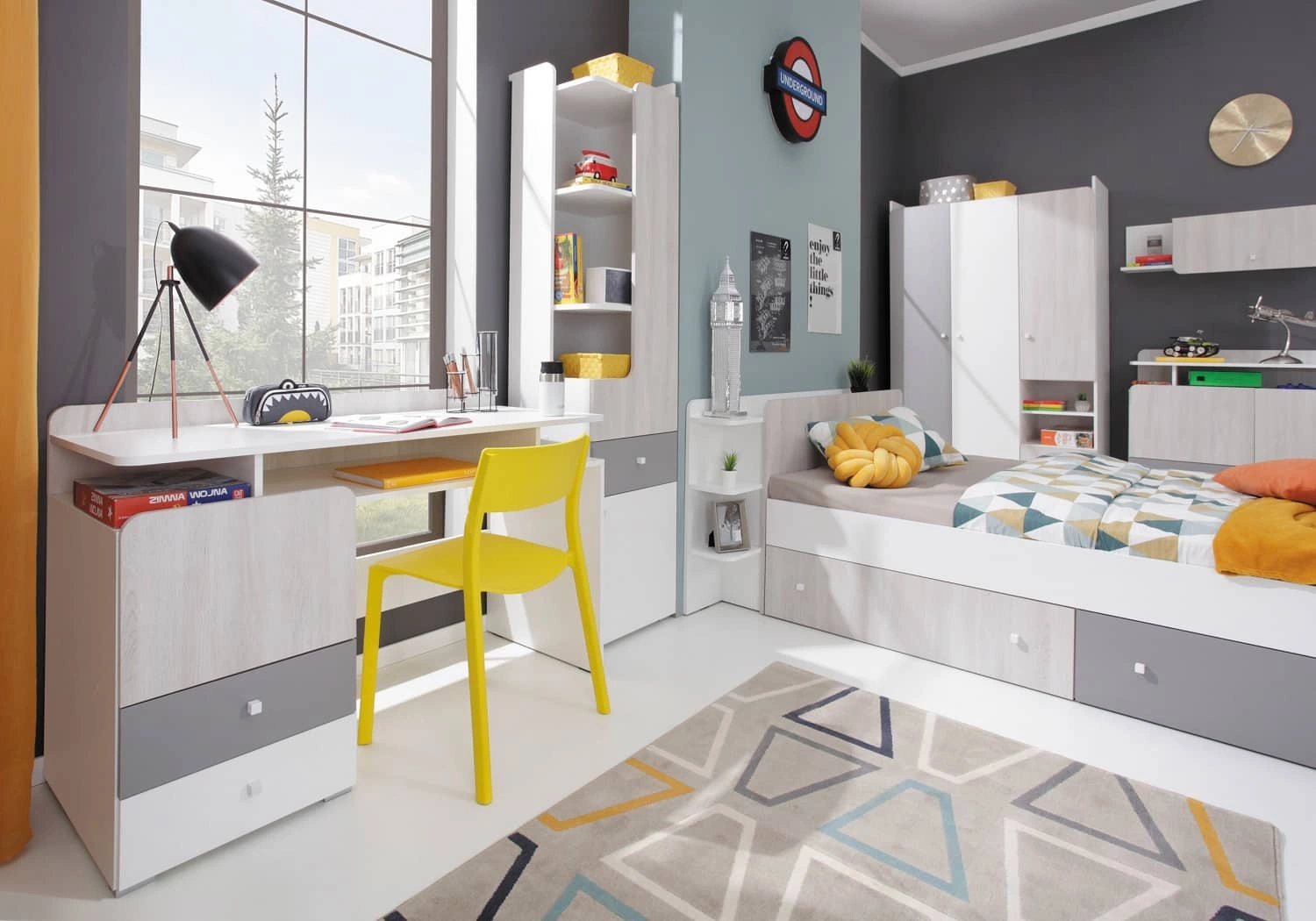 Schreibtisch mit Schubladen Arona in weiß / Eiche wilton weiß / grau ist ein Rezept für eine moderne und funktionelle Einrichtung eines Jugendzimmers.