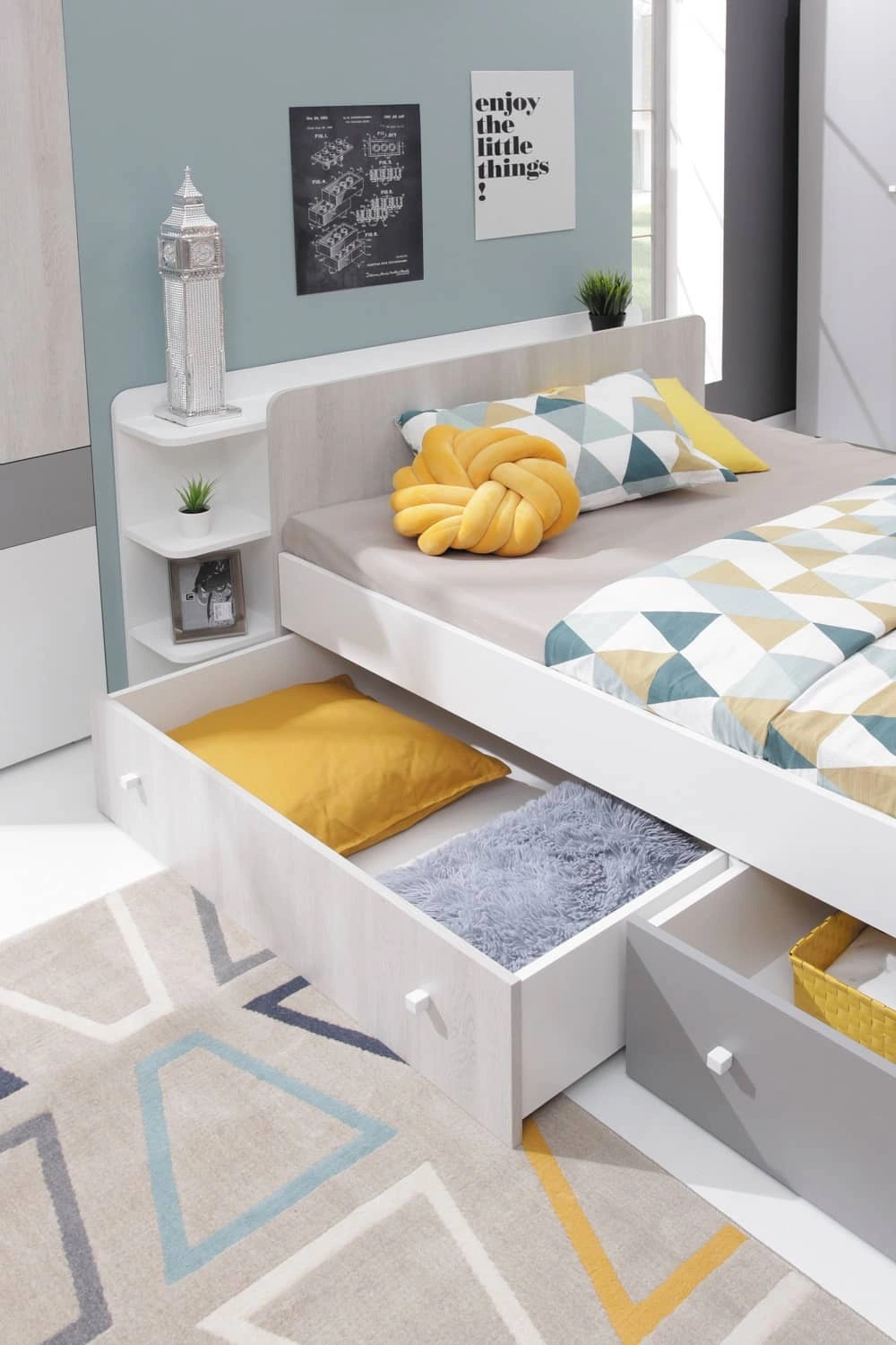 Das Arona-Möbelset in Weiß/Eiche Wilton Weiß/Grau ist eine stilvolle Lösung, die perfekt in jedes Jugend- oder Kinderzimmer passt.