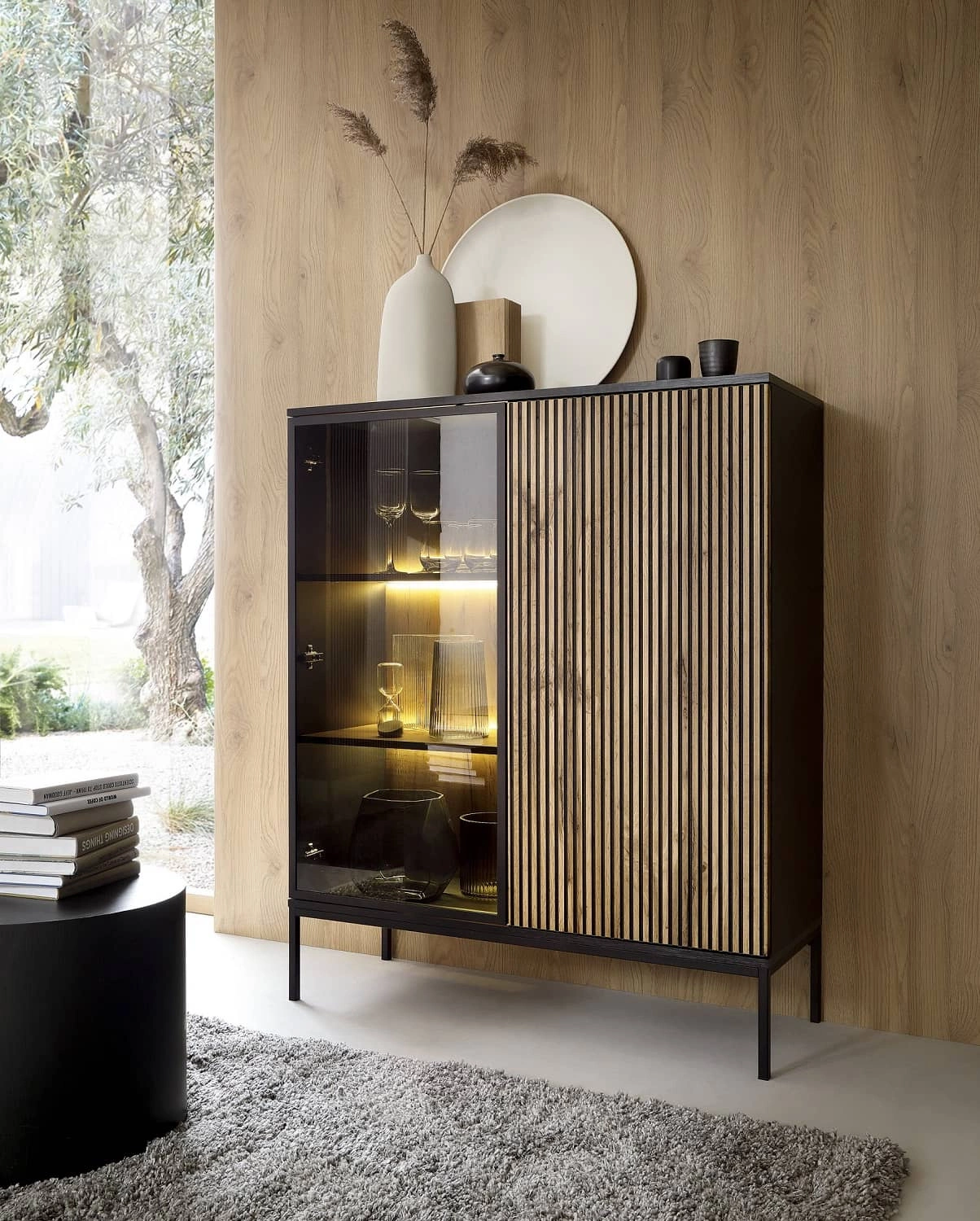 Die geriffelten Fronten sind aus 18 mm dickes MDF. Gehäuse aus hochwertiger laminierter Karton, die resistent gegen äußere Einflüsse wie Druckstellen, Stöße und unglückliche Kratzer ist. Die verglaste Front der Vitrine besteht aus einscheibensicherheitsglas in einem dunklen Farbton. Die Vitrine ist mit einem diskreten beleuchtung LED, es verleiht dem Design optische Leichtigkeit und Funktionalität. Die Struktur der Möbel wurde mit geschmackvollen metallbeine in Schwarz.