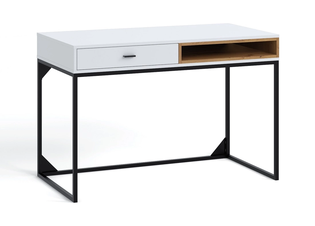 Schreibtisch Olier geschaffen für trendige und moderne Innenräume. Ein einfacher Vollton in farbe weiß aufgesetzt schwarz, metallrahmen sorgt für ein hohes Maß an Stabilität und verleiht einen Loftcharakter. Minimalistischer Griff und handwerklicher Eicheneinsatz sind Elemente, die ins Auge fallen und das Ganze sehr geschmackvoll aussehen lassen.