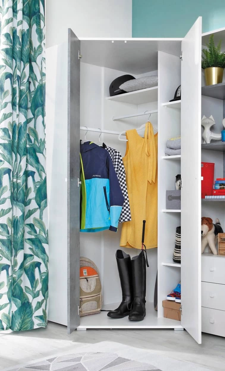 Das Möbelset Epsilon in Weiß/Beton ist eine stilvolle Lösung, die perfekt in jedes Jugend- oder Kinderzimmer passt.
