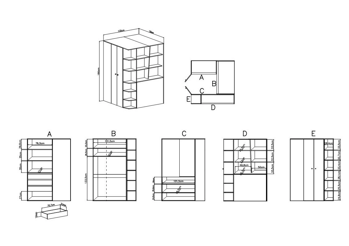 Breite 135 cm, höhe 190 cm und Tiefe 135 cm die Garderobe passt in jede Art von Raum! Der Dzeta-Eckschrank mit Einlegeböden garantiert komfortable und problemlose Nutzung und Langlebigkeit des gesamten Möbelstücks für viele Jahre der Nutzung.