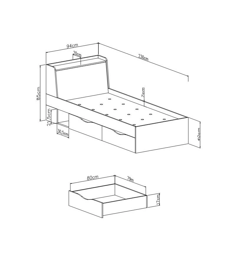 Zur Standardausstattung des Bettes gehören 2 Schubladen. Geräumige Schubladen bieten zusätzlichen Platz für mehr Ordnung im Zimmer. Sie sind ein großartiger Platz für Spielzeug oder Ersatzbettwäsche. Kopfstütze verfügt über ein Staufach, das sich hervorragend für Lieblingsbücher oder wichtige Dinge des Kindes eignet.