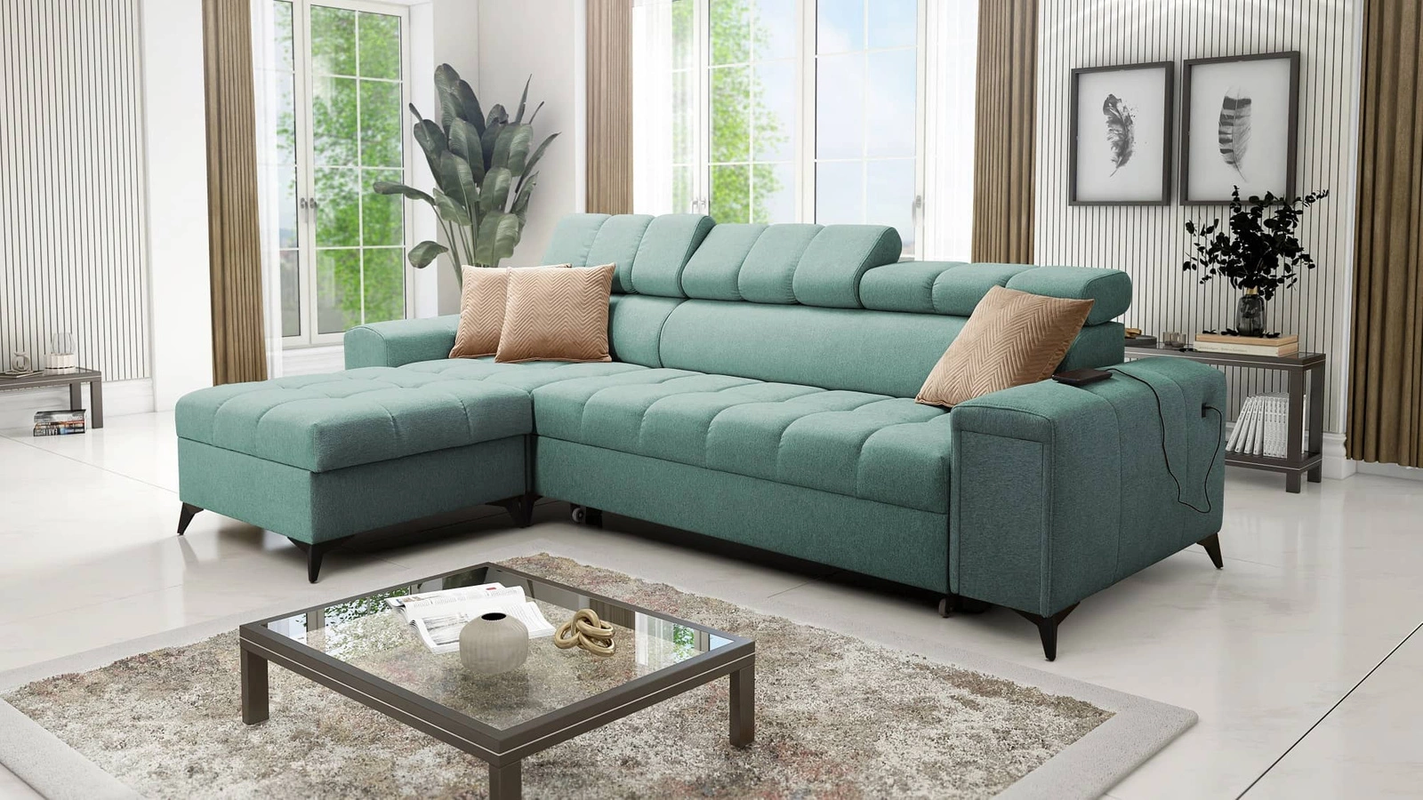 Bolmso Ecksofa in der Farbe mint mit verstellbaren Kopfstützen ist ein reizvolles Möbelstück mit der Garantie für höchsten Komfort und Funktionalität.