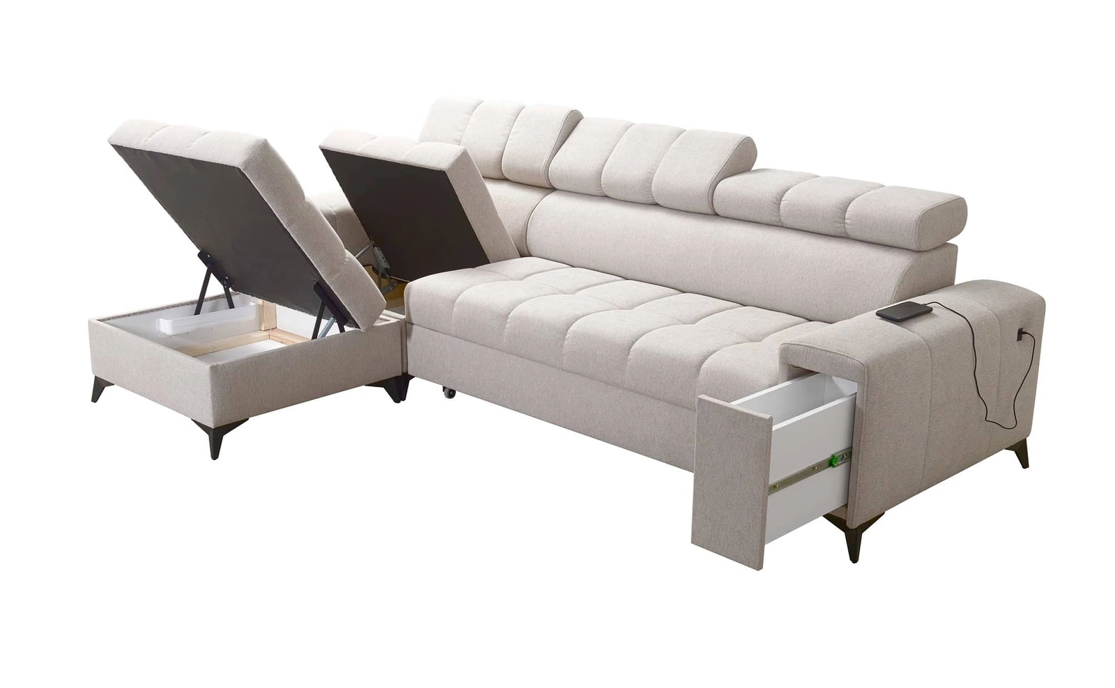 Zwei Bettkästen, eine Schlaffunktion, eine USB-Ladesteckdose in der Seite des Eckmöbels und eine Schublade mit Vollauszug in der Seite des Möbels sind weitere Merkmale dieses Möbels, die von allen Nutzern geschätzt werden.