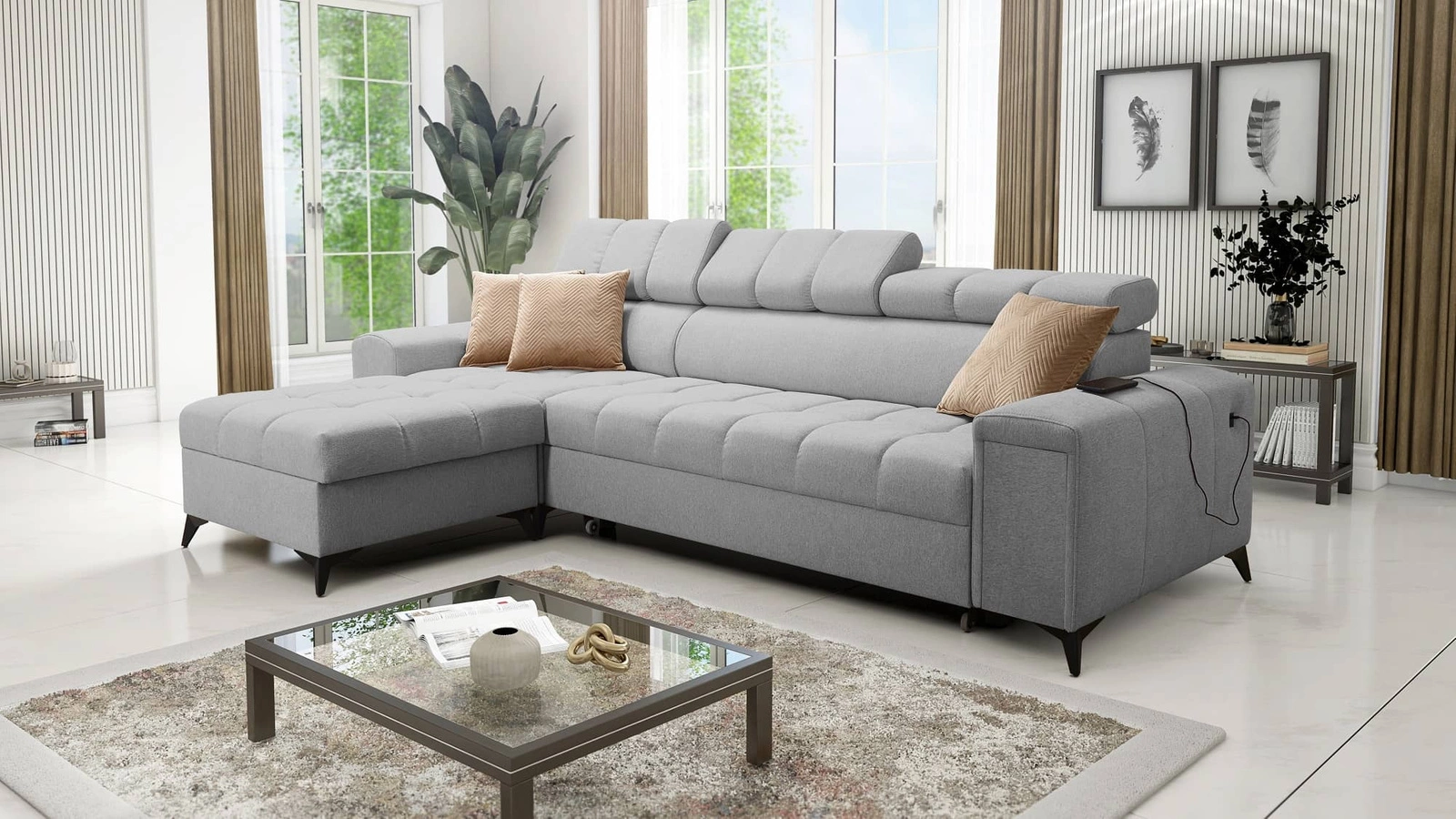 Zwei Bettkästen, eine Schlaffunktion, eine USB-Ladesteckdose in der Seite des Eckmöbels und eine Schublade mit Vollauszug in der Seite des Möbels sind weitere Merkmale dieses Möbels, die von allen Nutzern geschätzt werden.