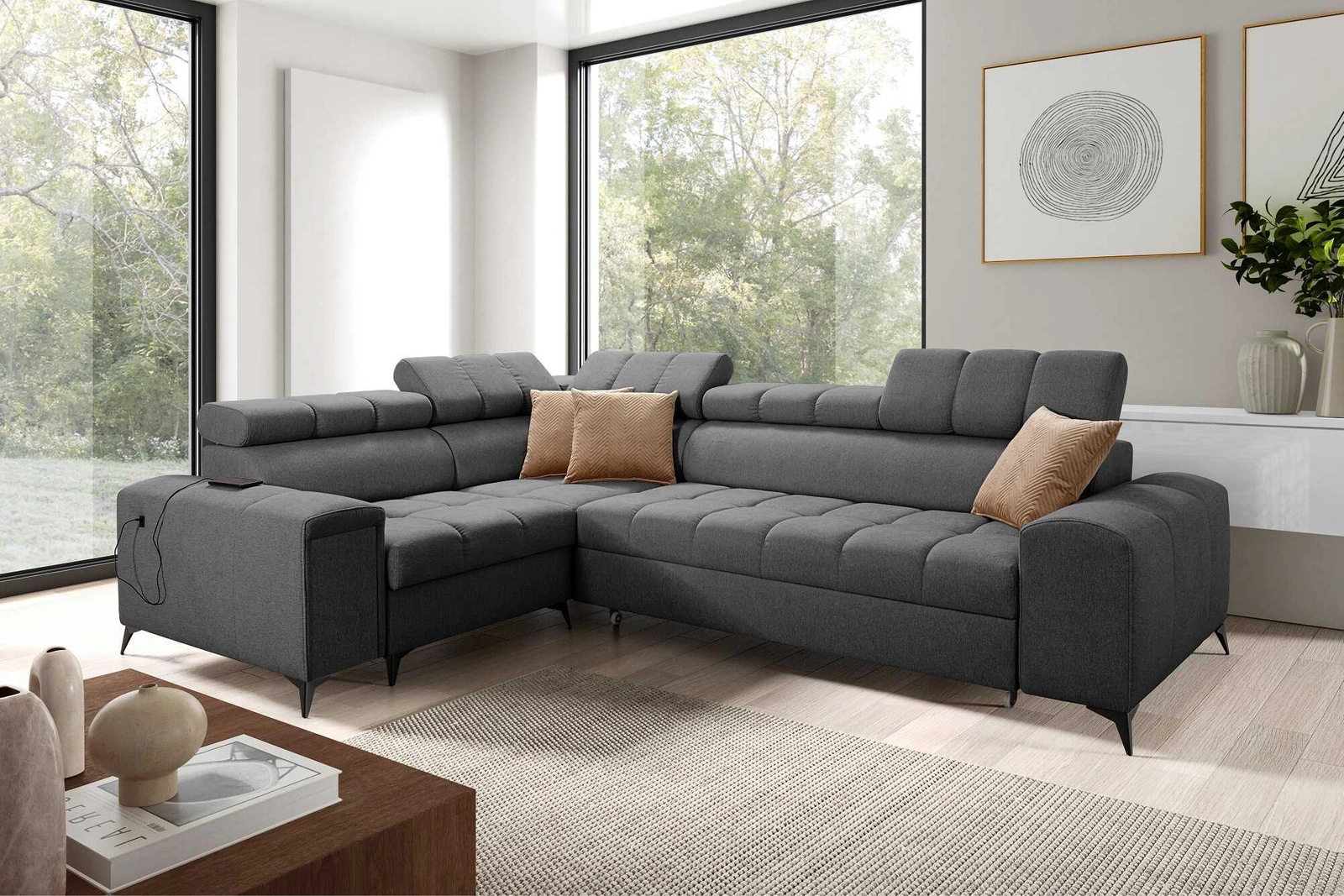 Weitere Merkmale dieses Möbelstücks, die von allen Nutzern geschätzt werden, sind ein Bettzeugbehälter, eine Schlaffunktion, eine USB-Ladebuchse in der Seite des Eckmöbels und eine Schublade mit Vollauszug in der Seite des Möbels.