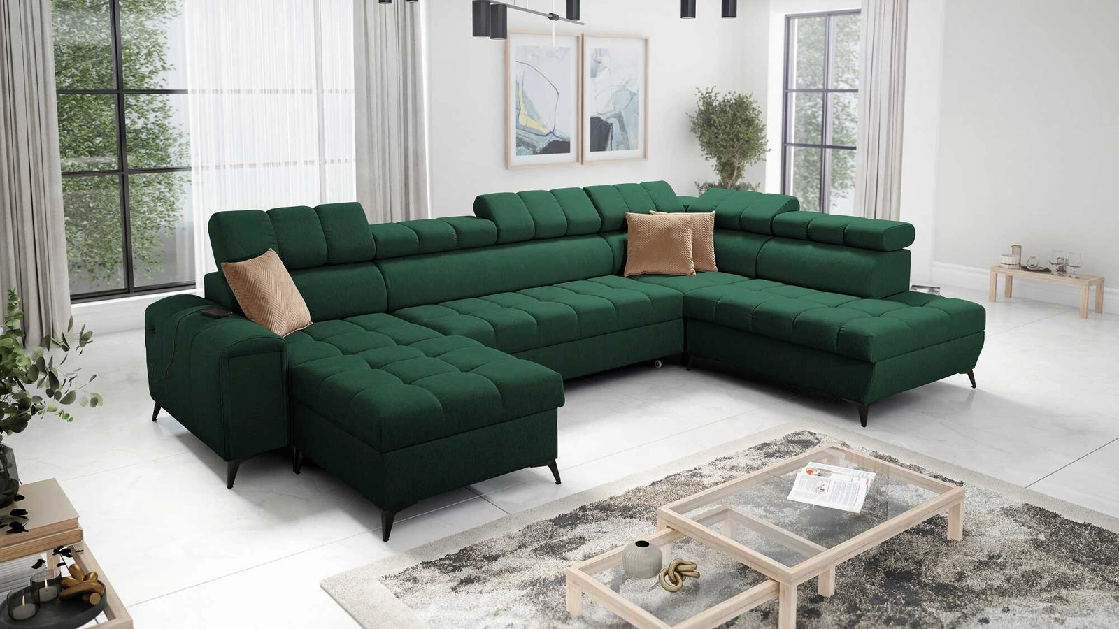 Bolmso Ecksofa VI in Grün mit verstellbaren Kopfstützen ist ein interessant aussehendes Möbelstück mit einer Garantie für höchsten Komfort und Funktionalität.