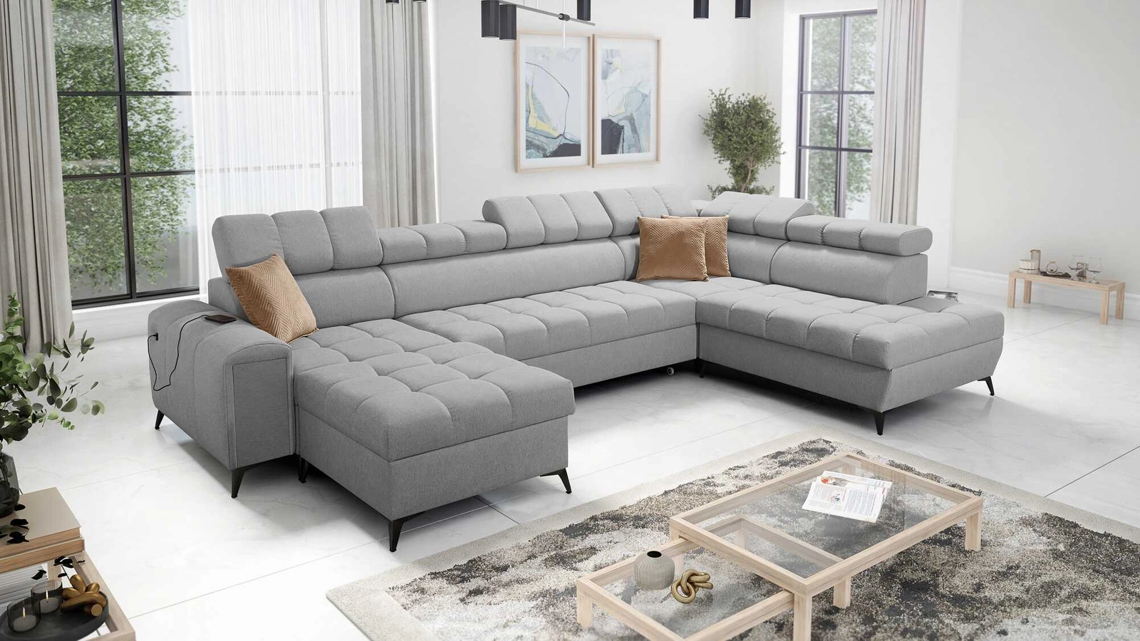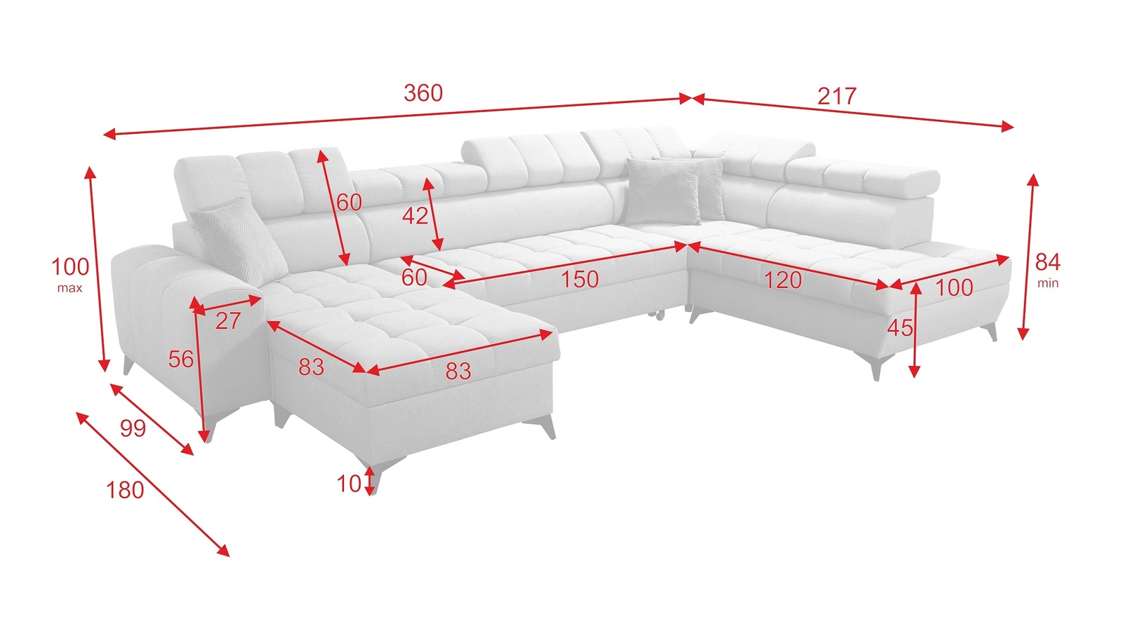 Die Abmessungen der Möbel sind optimal. Breite der Ecke 360 cm, maximale Höhe 100 cm und Tiefe 217 cm. Die Liegefläche der Eckeinheit beträgt 127x284 cm. Die Sitzhöhe des Möbels beträgt 45 cm und die maximale Höhe der Rückenlehne beträgt 60 cm. Gewellte Federn und T30-Polyurethanschaum ist das Material, aus dem der Sitz der Ecke gefertigt ist. Feste Rückenlehne mit verstellbaren Kopfstützen garantiert eine bequeme Entspannung nach einem langen Tag, die von allen, die auf diesem außergewöhnlichen Ecksofa sitzen, geschätzt werden wird! Der Eckschrank ist aus hochwertigen Materialien gefertigt, die resistent gegen äußere Einflüsse wie Möbelbezüge und verschiedene Arten von Stößen sind.