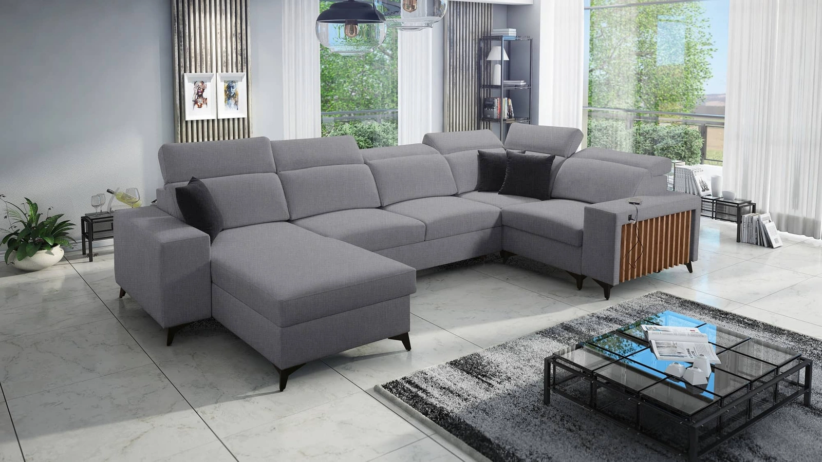 Ecksofa Kelly IV in Grau mit verstellbaren Kopfstützen ist ein interessant aussehendes Möbelstück mit einer Garantie für höchsten Komfort und Funktionalität.