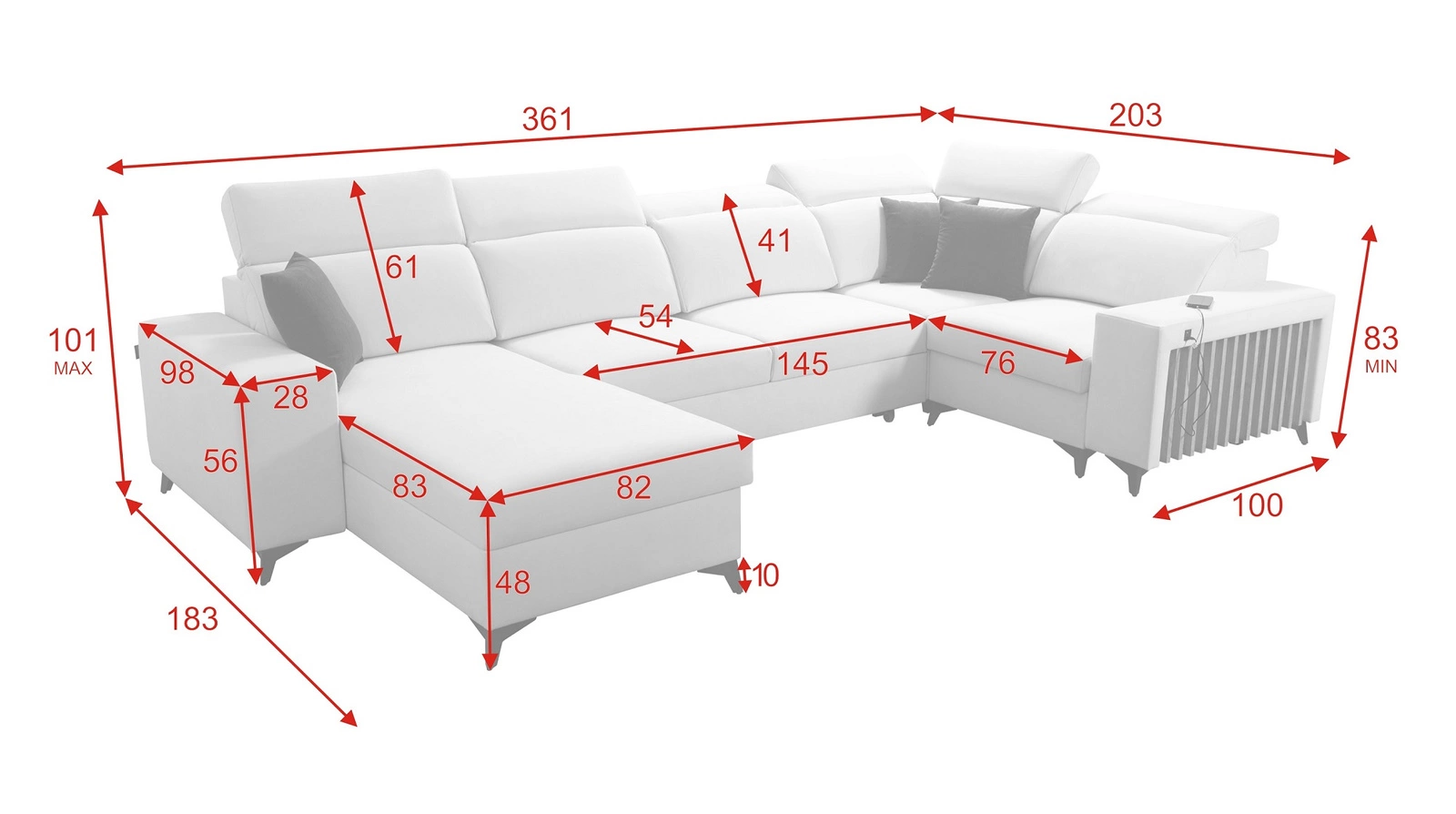 Breite der Ecke 361 cm, maximale Höhe 101 cm und Tiefe 203 cm. Die Liegefläche des Eckschrankes beträgt 122x283 cm. Die Sitzhöhe des Möbels beträgt 48 cm und die maximale Höhe der Rückenlehne beträgt 61 cm. Gewellte Federn und T30-Polyurethanschaum ist das Material, aus dem der Sitz der Ecke gefertigt ist. Feste Rückenlehne mit verstellbaren Kopfstützen garantiert eine bequeme Entspannung nach einem langen Tag, die von allen, die auf diesem außergewöhnlichen Ecksofa sitzen, geschätzt werden wird! Der Eckschrank ist aus hochwertigen Materialien gefertigt, die resistent gegen äußere Einflüsse wie Möbelbezüge und verschiedene Arten von Stößen sind.