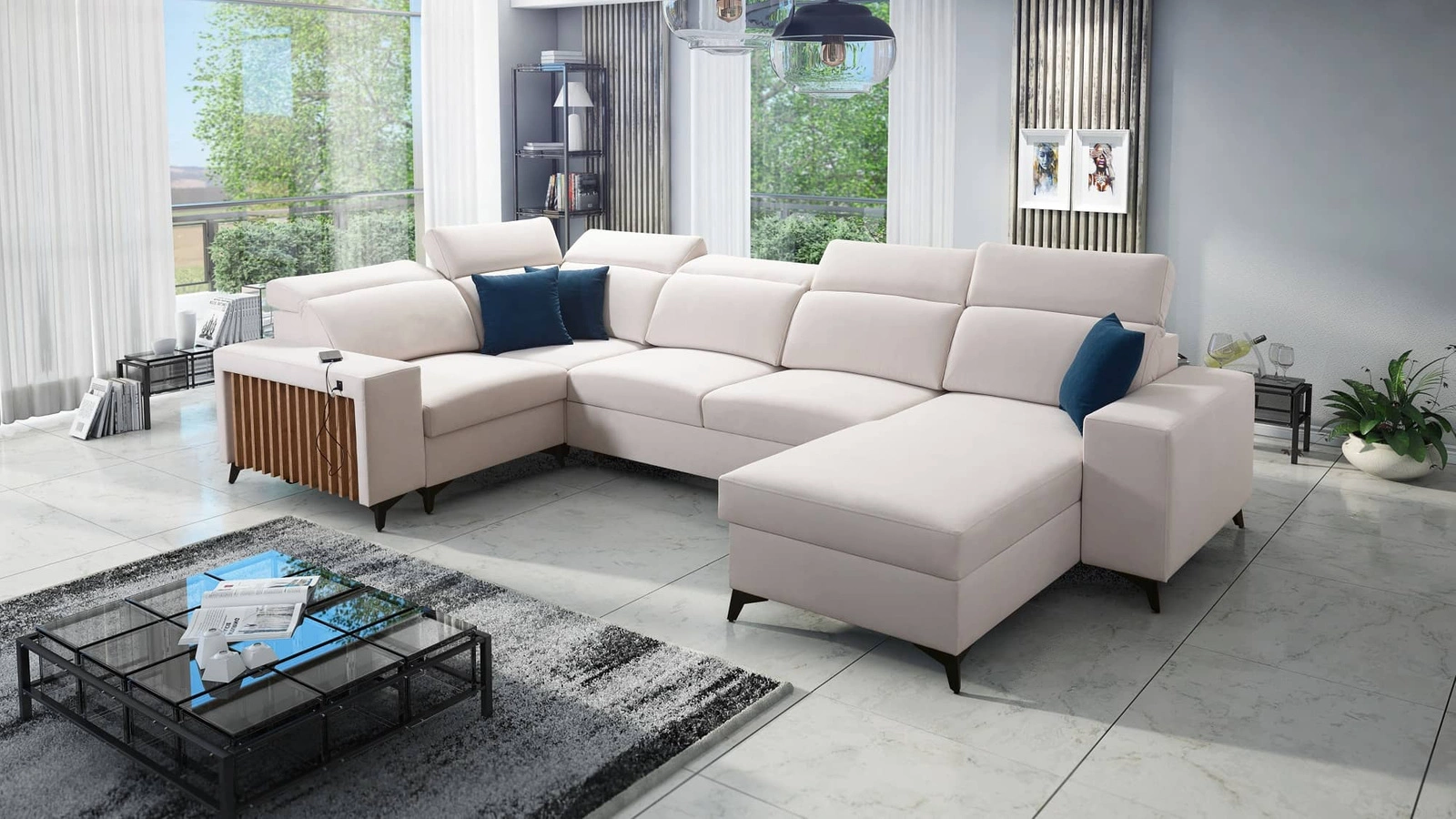 Ecksofa Kelly IV in Elfenbein mit verstellbaren Kopfstützen ist ein interessant aussehendes Möbelstück mit einer Garantie für höchsten Komfort und Funktionalität.