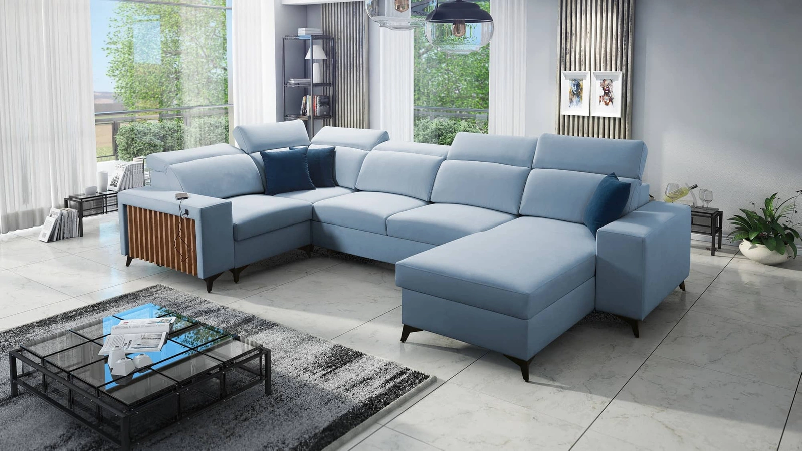 Ecksofa Kelly IV in Blau mit verstellbaren Kopfstützen ist ein interessant aussehendes Möbelstück mit einer Garantie für höchsten Komfort und Funktionalität.