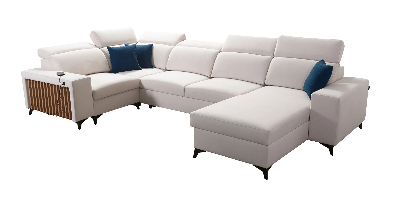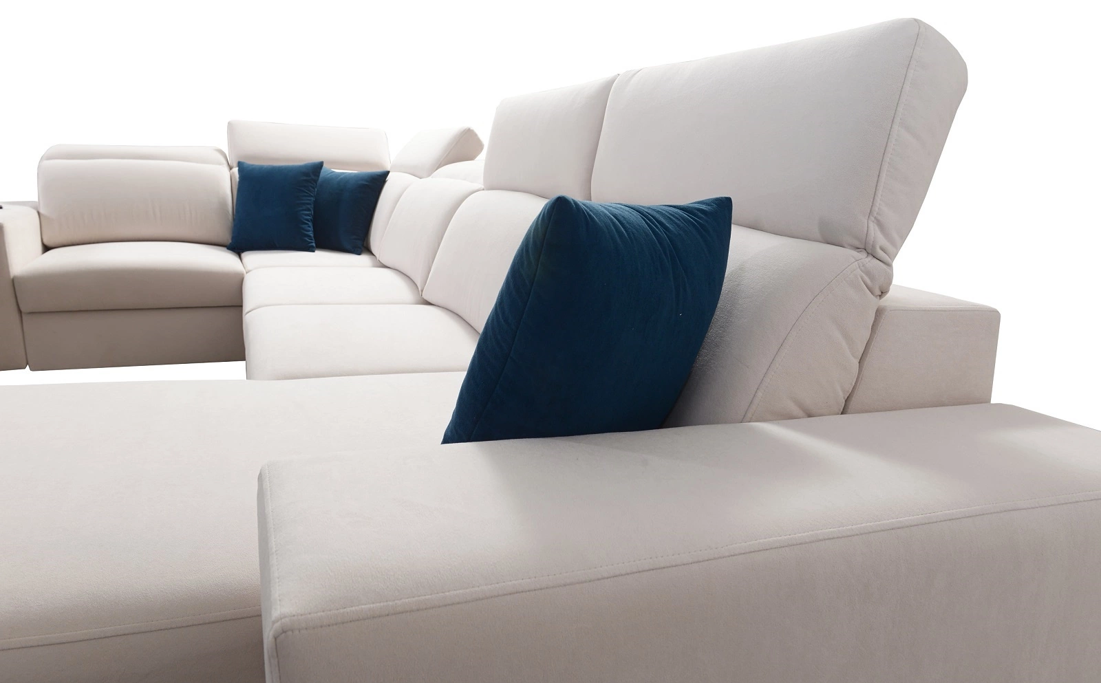 Breite der Ecke 361 cm, maximale Höhe 101 cm und Tiefe 203 cm. Die Liegefläche des Eckschrankes beträgt 122x283 cm. Die Sitzhöhe des Möbels beträgt 48 cm und die maximale Höhe der Rückenlehne beträgt 61 cm. Gewellte Federn und T30-Polyurethanschaum ist das Material, aus dem der Sitz der Ecke gefertigt ist. Feste Rückenlehne mit verstellbaren Kopfstützen garantiert bequeme Entspannung nach einem langen Tag, die von allen, die auf diesem einzigartigen Ecksofa sitzen, geschätzt wird! Der Eckschrank ist aus hochwertigen Materialien gefertigt, die resistent gegen äußere Einflüsse wie Möbelbezüge und verschiedene Arten von Stößen sind.